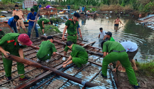 Sau khi cơn lốc đi qua, Công an huyện An Minh (An Giang) đã điều động 30 cán bộ chiến sĩ phối hợp cùng lực lượng tại chỗ của địa phương nhanh chóng đến hiện trường từng bước giúp dân khắc phục hậu quả.