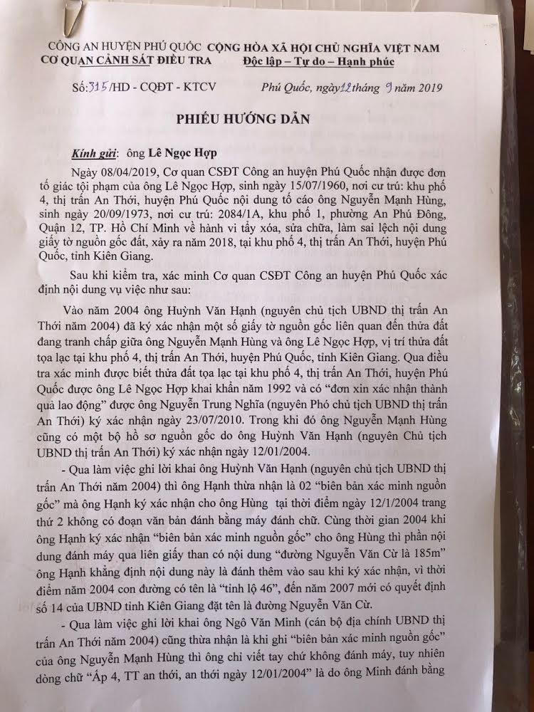 Mới đây, tại văn bản trả lời ông Hợp, Cơ quan CSĐT Công an huyện Phú Quốc xác định, ông Hùng đã có hành vi sửa chữa, làm sai lệch nội dung giấy tờ nguồn gốc đất để làm thủ tục hợp thức hóa quyền sử dụng đất.