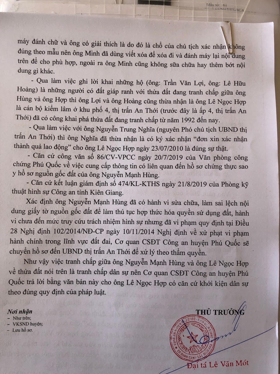 Tuy xác định ông Hùng đã có hành vi sửa chữa, làm sai lệch nội dung giấy tờ nguồn gốc đất để làm thủ tục hợp thức hóa quyền sử dụng đất; nhưng CQĐT Công an huyện Phú Quốc cho rằng hành vi này chưa đến mức truy cứu trách nhiệm hình sự. Công an cho rằng hành vi vi phạm quy định tại Điều 28, Nghị định 102/2014/NĐ-CP về xử phạt hành chính trong lĩnh vực đất đai nên sẽ chuyển hồ sơ đến UBND thị trấn An Thới để xử lý theo thẩm quyền.