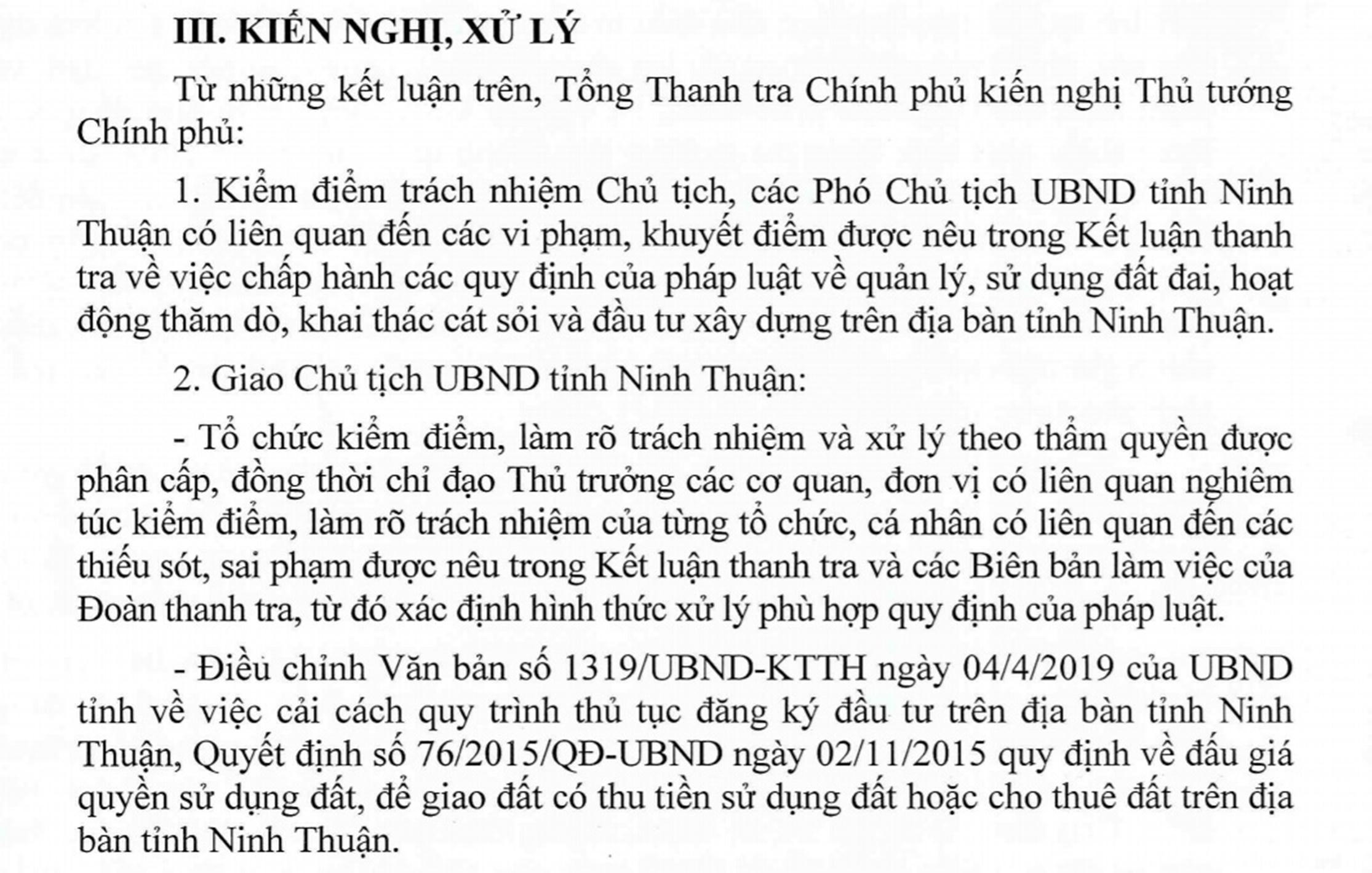 Từ những kết luận nêu trên, Thanh tra Chính phủ kiến nghị Thủ tướng Chính phủ kiểm điểm trách nhiệm Chủ tịch và các Phó Chủ tịch UBND tỉnh Ninh Thuận có liên quan đến các vi phạm, khuyết điểm được nêu trong kết luận thanh tra.