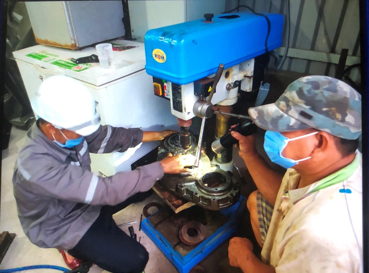 Trung tâm Dịch vụ hậu cần - kỹ thuật đảo Sinh Tồn thuộc Hải đoàn 129, Tổng công ty Tân Cảng Sài Gòn vừa khắc phục thành công sự gãy ốc mâm hộp số tàu cá PY 90343 TS của tỉnh Phú Yên