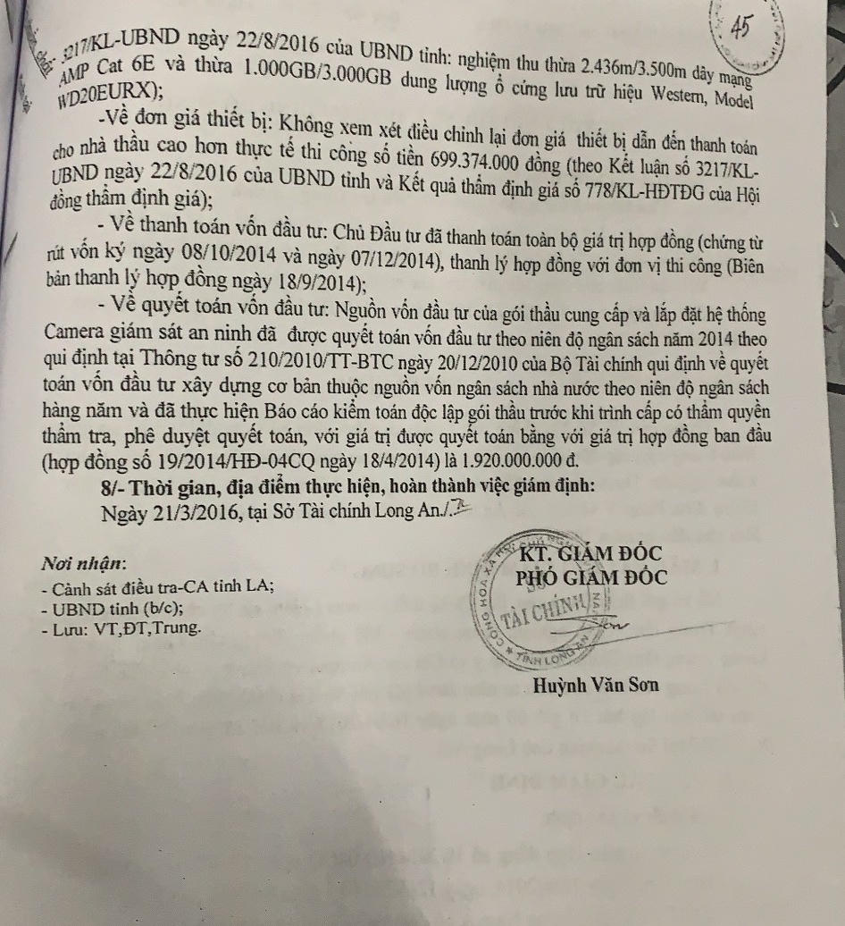 Giữa tháng 9/2014, hai bên nghiệm thu bàn giao khối lượng hoàn thành đưa vào sử dụng và thanh lý hợp đồng, giá trị 1,92 tỷ. Cần lưu ý, mãi 5 năm sau, ngày 18/9/2019, UBND Long An mới có Quyết định 3411/QĐ-UBND phê duyệt quyết toán vốn đầu tư dự án này.