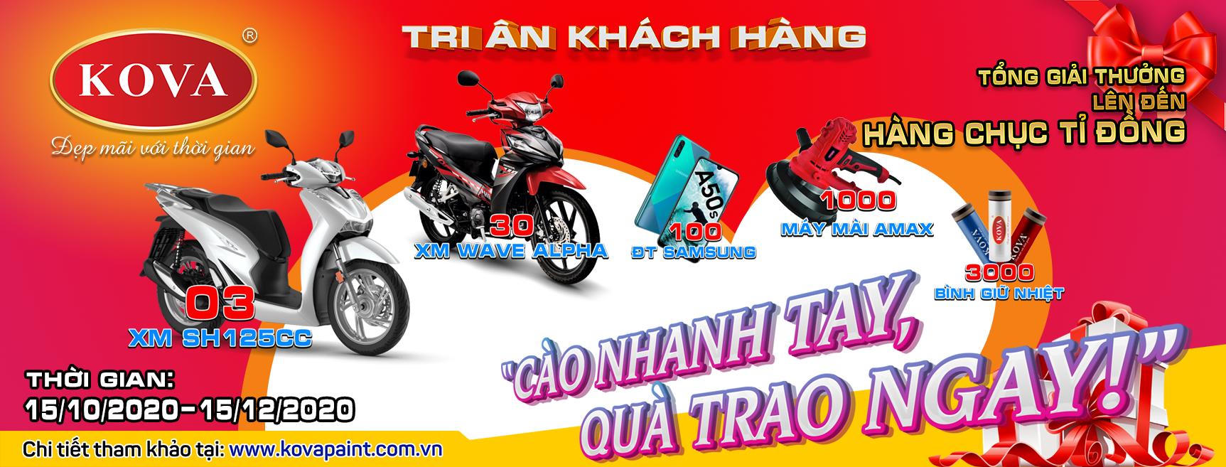 Thay lời cảm ơn chân thành tới khách hàng đã tín nhiệm và tin dùng các sản phẩm sơn và chống thấm KOVA trong suốt thời gian qua, Công ty TNHH Sơn KOVA tổ chức chương trình “Tri ân khách hàng năm 2020” với nhiều phần quà hấp dẫn áp dụng từ ngày 15/10/2020 đến hết ngày 15/12/2020.