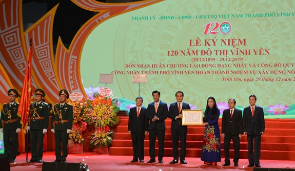 (PLVN) - Sáng 29/12, Thành ủy, HĐND, UBND, Ủy ban MTTQ Việt Nam thành phố Vĩnh Yên (Vĩnh Phúc) tổ chức Lễ kỷ niệm 120 năm đô thị Vĩnh Yên (29-12-1899/ 29-12-2019), đón nhận Huân chương Lao động hạng Nhất và công bố quyết định công nhận thành phố Vĩnh Yên hoàn thành nhiệm vụ xây dựng nông thôn mới.