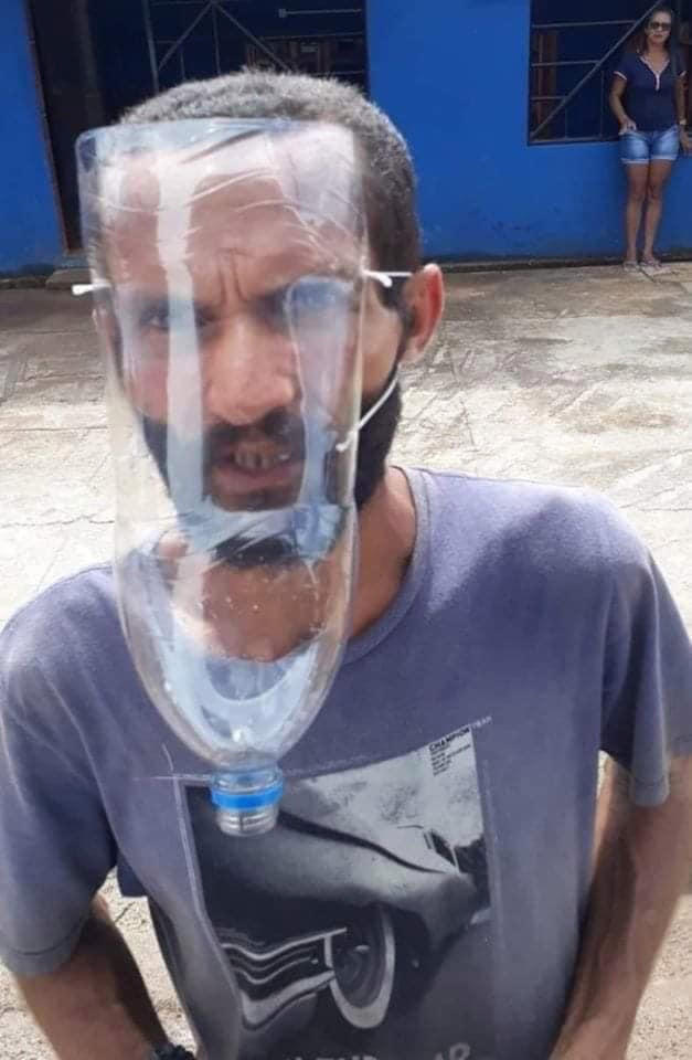 | Một người đàn ông đeo chai nhựa cắt để bảo vệ mình khỏi những người bị nhiễm bệnh. |