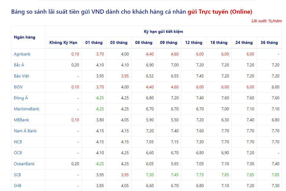 Với kỳ hạn dài hơn như 24 tháng và 36 tháng, NCB có lãi suất cao nhất cho khách hàng gửi tại quầy là 7,70%. Tương tự, SCB có lãi suất cao nhất cho khách hàng muốn gửi tiết kiệm online, đều ở mức 7,85%.