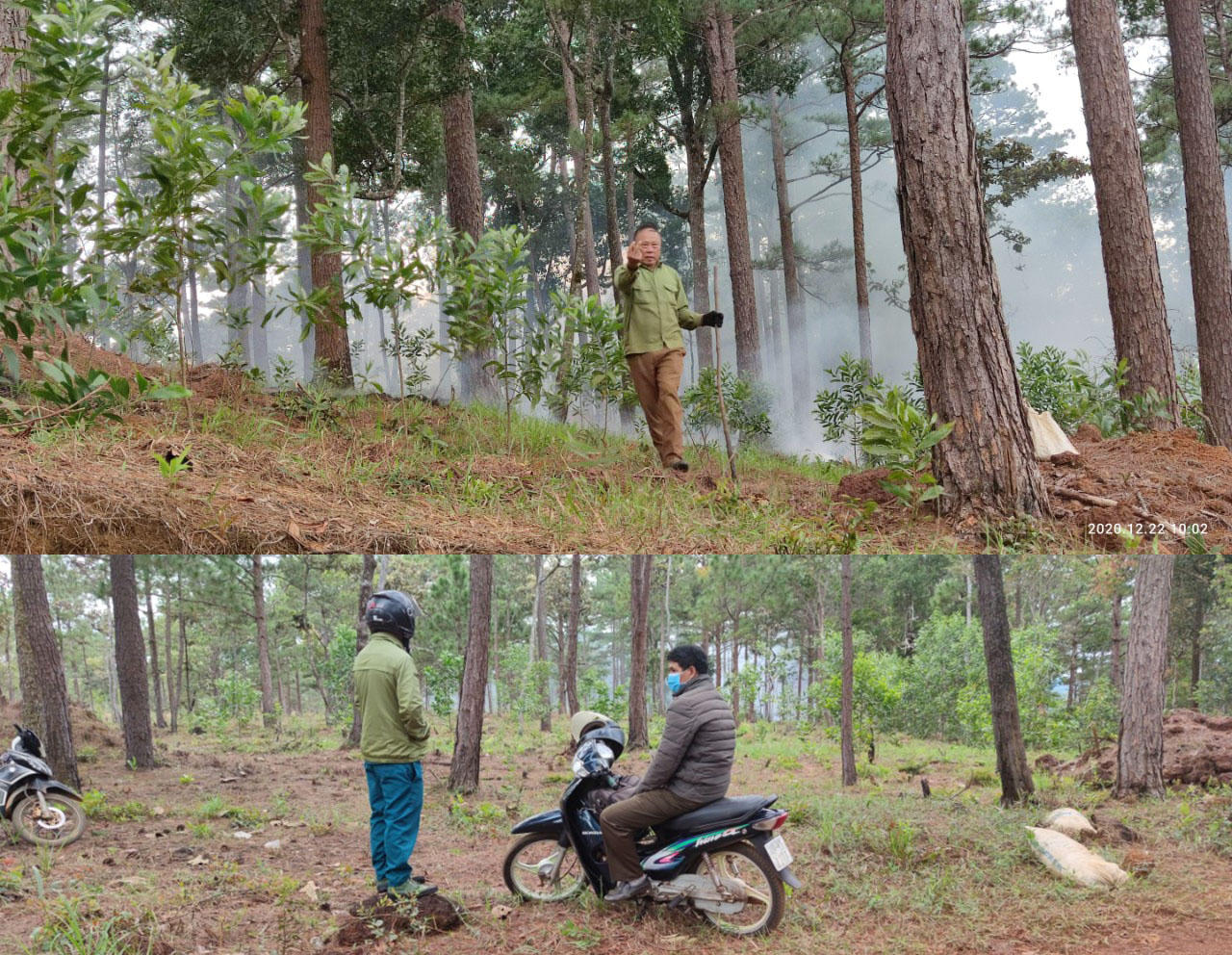 Người đàn ông tên N.V.D, ngụ thôn 2, xã Lộc Phú đang đốt thực bì dưới tán rừng tự nhiên do Ban Quản lý rừng phòng hộ ĐamB’ri quản lý. Đây là một phần trong số 231,22 héc ta mà UBND huyện Bảo Lâm thu hồi sau thanh tra. Đáng nói hơn, mặc dù một cán bộ kiểm lâm và một cán bộ Ban Quản lý rừng phòng hộ ĐamB’ri có mặt nhưng người đàn ông này vẫn ngang nhiên tác động vào diện tích rừng. Xung quanh đó là hàng chục héc ta cà phê, trà và các loại cây khác đã thay thế rừng thông nhiều năm tuổi.
