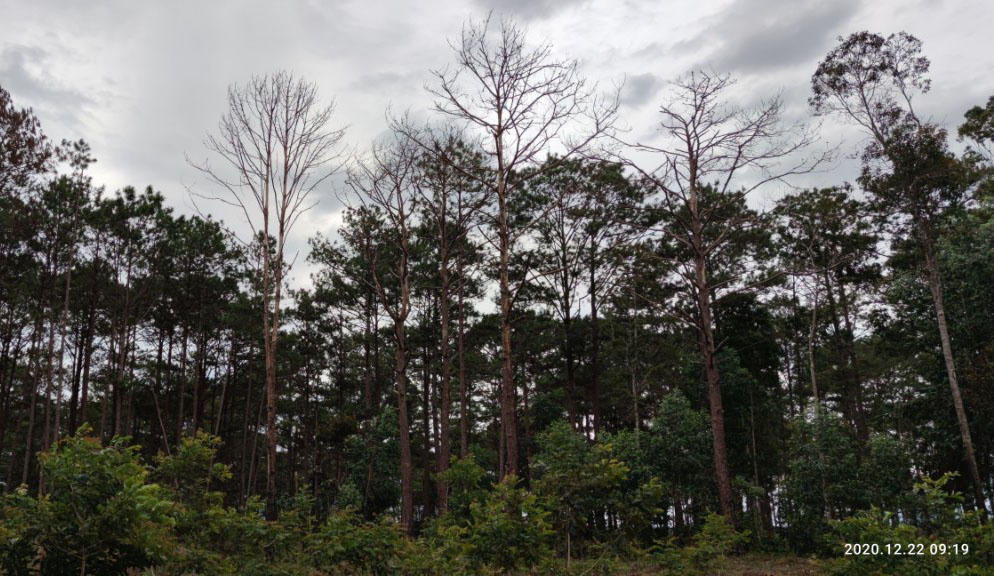 Dạo một vòng rừng thông thuộc tiểu khu 439, chúng tôi phát hiện những cây thông đã và đang chết dần khi mà dưới tán rừng, thông bị đốn hạ nằm la liệt. Thay cho những gốc thông là những cây bơ xanh tốt.
