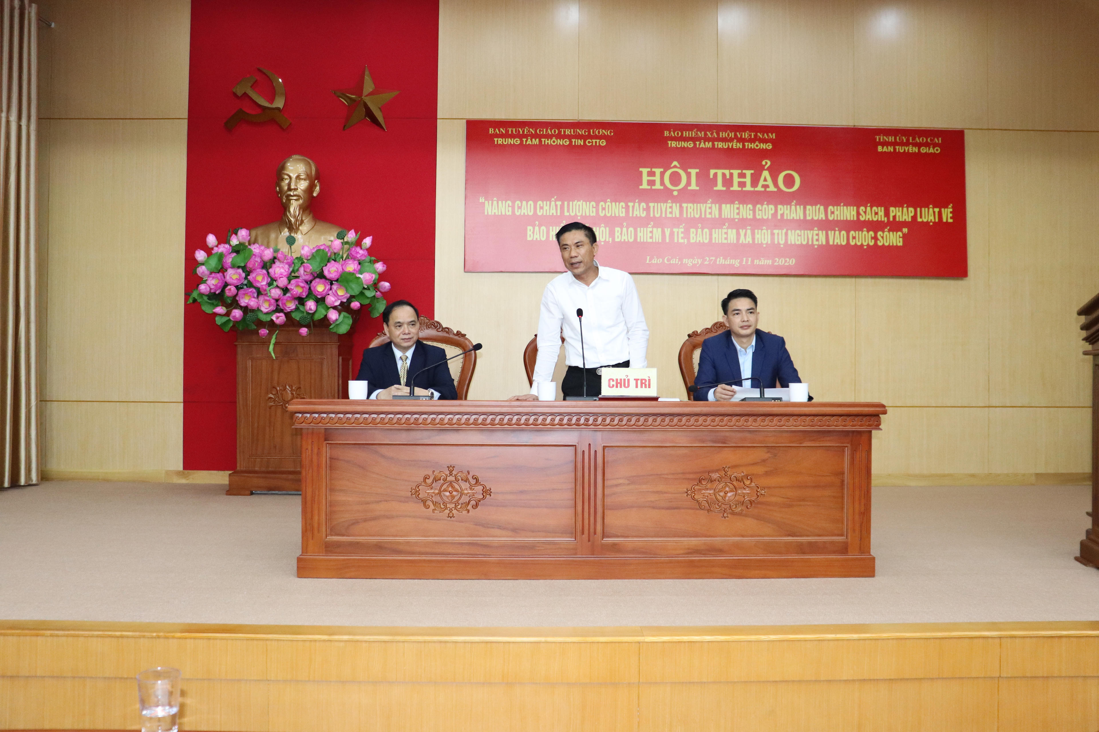 Chủ trì hội thảo có đồng chí Đoàn Văn Báu, Giám đốc Trung tâm Thông tin Công tác tuyên giáo, Ban Tuyên giáo Trung ương; đồng chí Nguyễn Thành Nam, Phó Trưởng Ban Tuyên giáo Tỉnh ủy Lào Cai; đồng chí Đường Minh Tấn, Giám đốc Bảo hiểm Xã hội tỉnh Lào Cai. Dự hội thảo có các đồng chí lãnh đạo sở, ngành, văn phòng chuyên môn, văn phòng Bảo hiểm xã hội tỉnh.