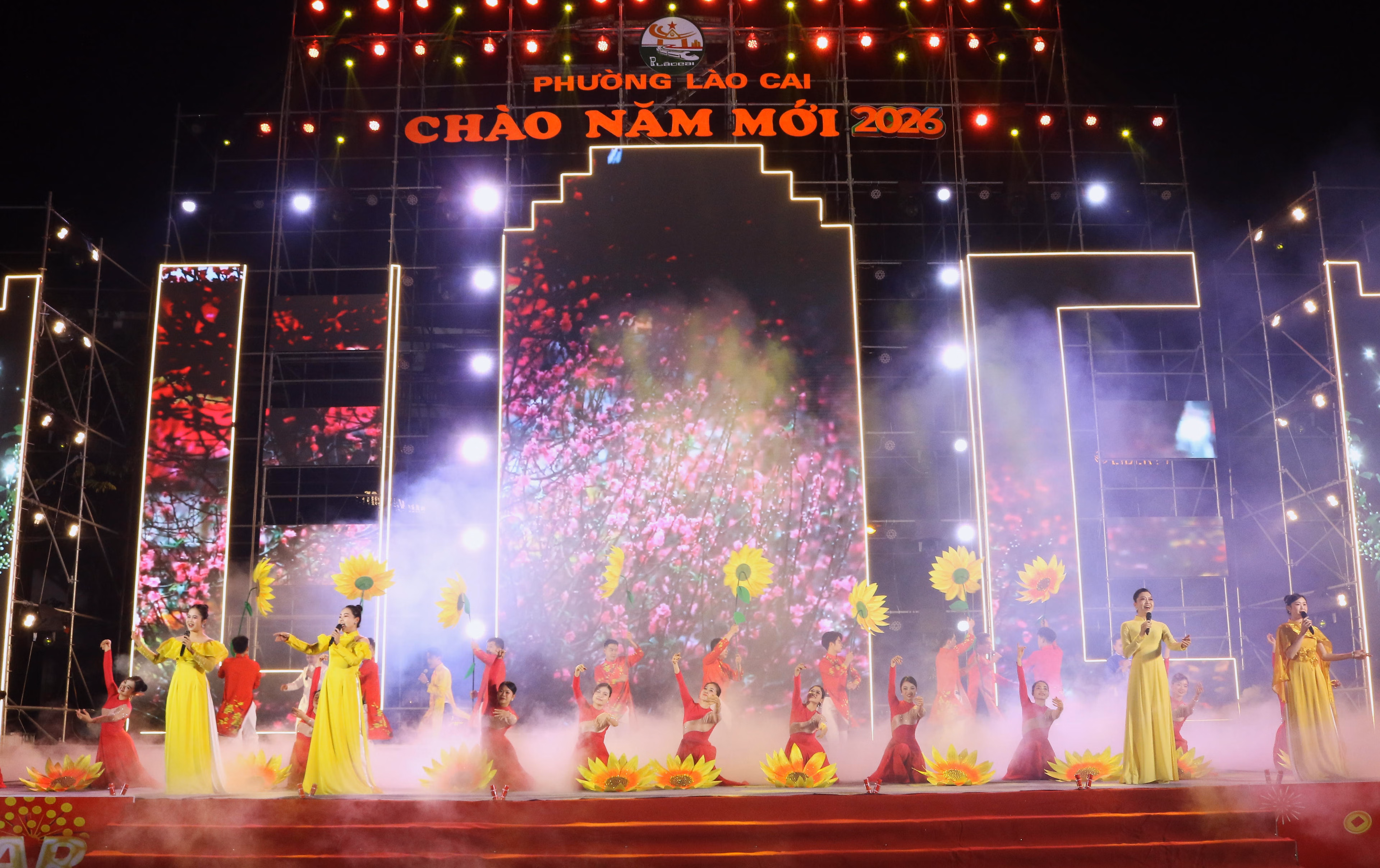 Cao trào của đêm nghệ thuật là khoảnh khắc toàn thể đại biểu, nghệ sĩ và khán giả cùng đứng lên hát vang ca khúc “Happy New Year”, chào đón năm 2026 với niềm tin mới, khát vọng mới trong sắc pháo hoa rực sáng bầu trời phường Lào Cai.