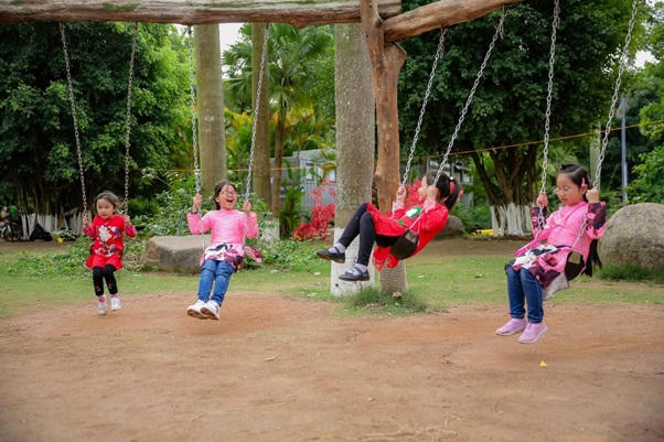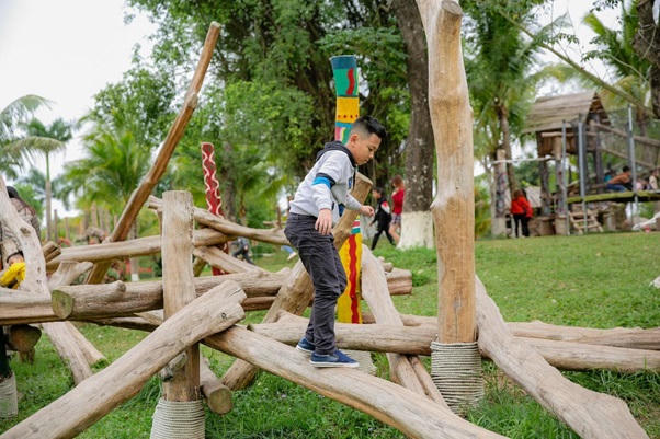 Các gia đình có trẻ nhỏ còn có cơ hội trải nghiệm khu vui chơi với đa dạng các trò chơi dân gian như: ném còn, đánh đu, đi cầu kiều, hay các trò chơi vận động như nhà gỗ, nhảy đệm... Các trò chơi tại đây mang tính gợi mở, khuyến khích các hoạt động thể chất đòi hỏi vận động nhiều như leo trèo, thăng bằng, tăng khả năng nhận diện không gian hình học… khiến trẻ vui vẻ, hoạt bát, nhanh nhẹn và giao tiếp tự tin. Toàn bộ công trình trò chơi được chế tạo từ gỗ tự nhiên, tạo cảm giác gần gũi, đồng thời kích thích sự tò mò của trẻ.