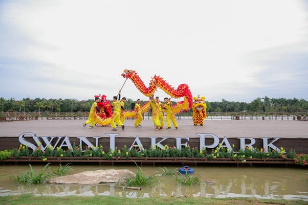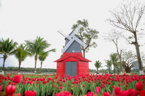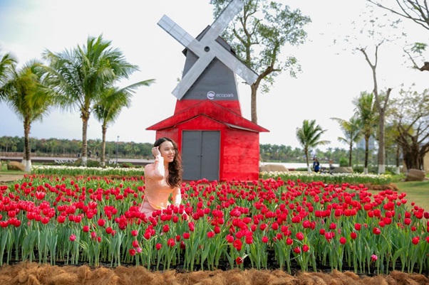 Ngay từ khi bước vào cổng, du khách được đón chào bằng con đường hoa muôn màu ngập tràn sắc xuân. Bên cạnh những loài hoa cúc, hoa hồng, hoa cúc hồ điệp… sẵn có tại Công viên hồ thiên nga (Ecopark), hàng vạn cây hoa tuylip được nhập khẩu trực tiếp từ Hà Lan trước Tết bung nở rực rỡ, tạo nên cảnh sắc thiên nhiên thơ mộng, đưa du khách như lạc vào xứ trời Âu.
