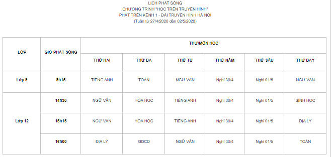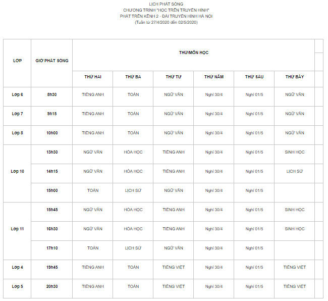 Sau đây là lịch phát sóng các môn học trên 2 kênh của Đài Phát thanh - Truyền hình Hà Nội: