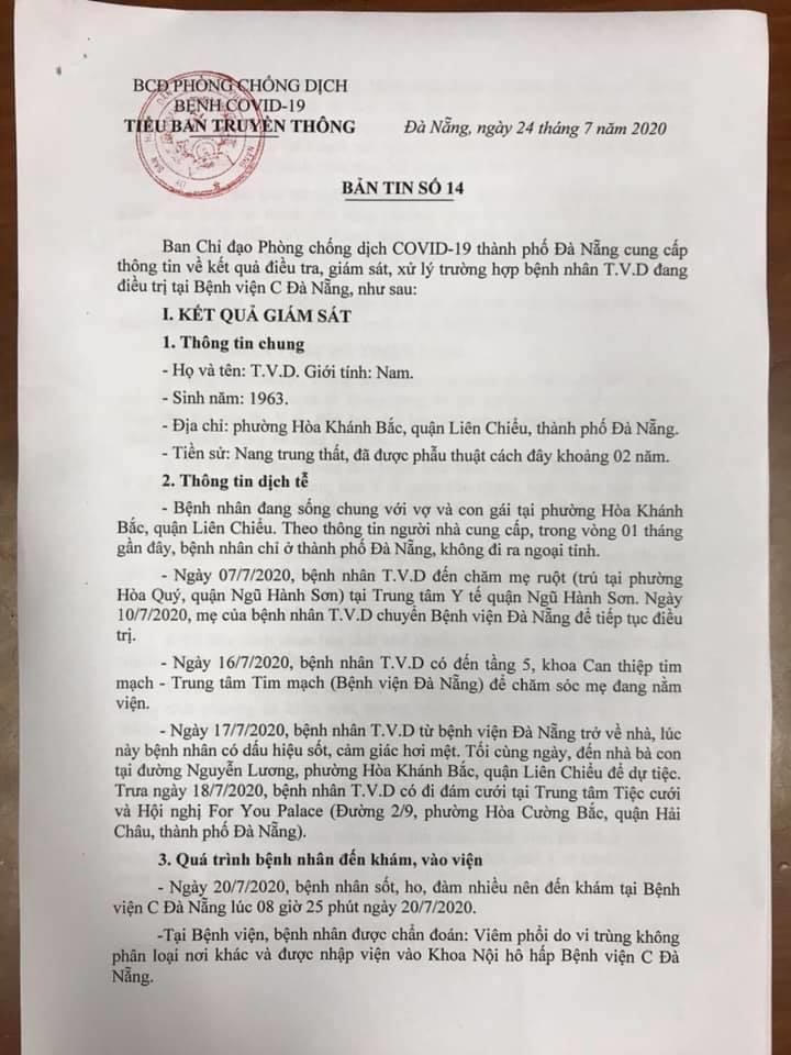 Ngày 7/7, bệnh nhân T.V.D đến chăm mẹ ruột (ngụ tại phường Hòa Quý, quận Ngũ Hành Sơn) tại Trung tâm Y tế quận Ngũ Hành Sơn. Ngày 10/7, mẹ của bệnh nhân T.V.D chuyển Bệnh viện Đà Nẵng để tiếp tục điều trị.