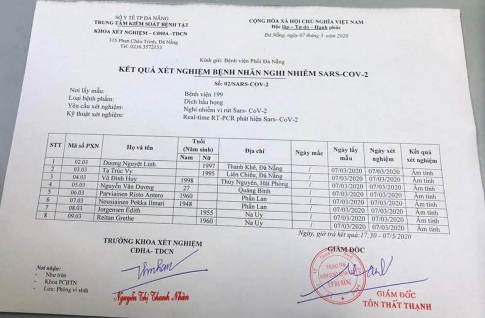 Theo kết quả xét nghiệm lúc 17h30 ngày 7/3, cả 6 trường hợp trên đều âm tính với Sars-Cov-2.