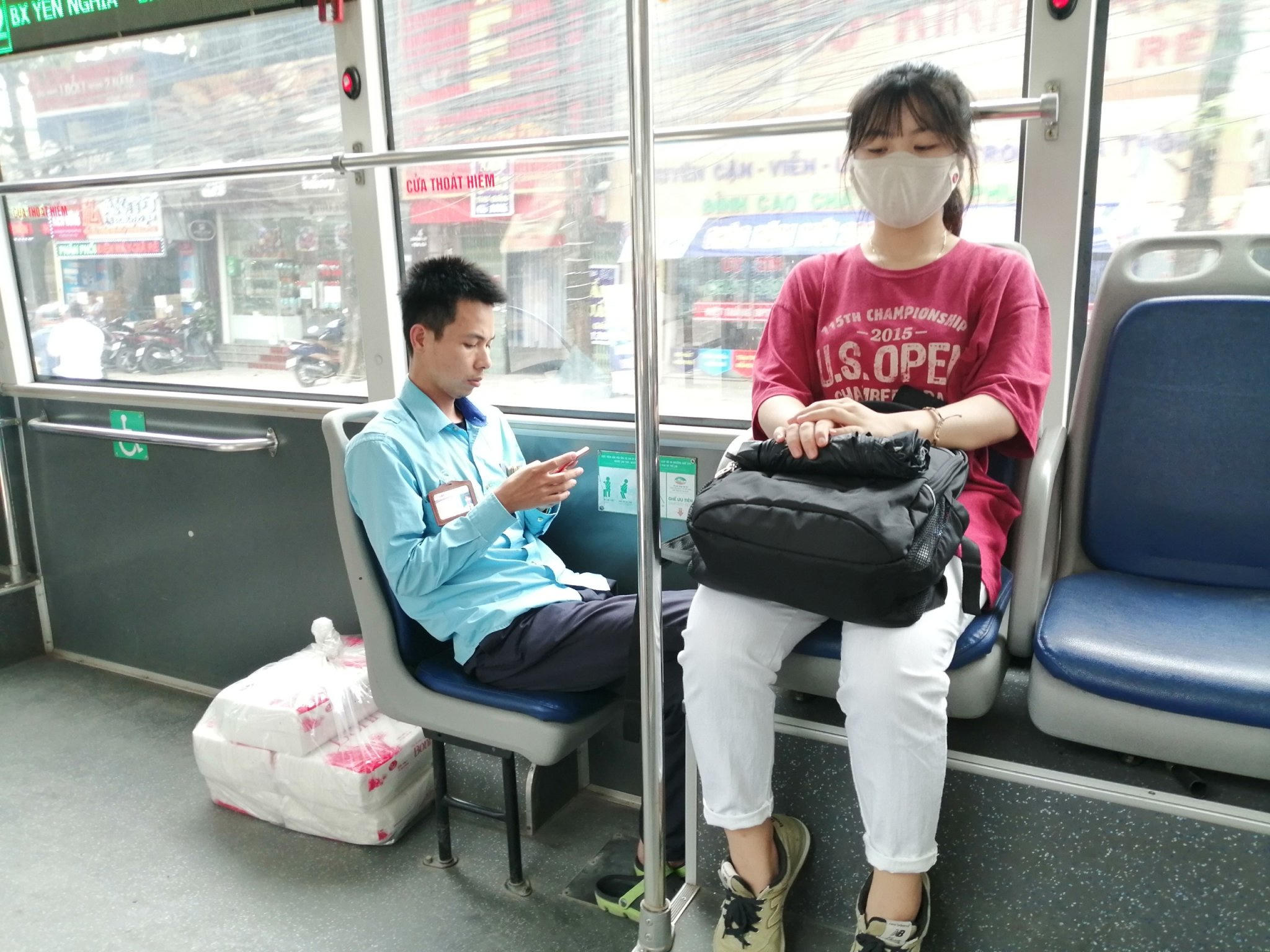 Hành khách lên xe khá nghiêm túc tuẩn thủ quy định về việc đeo khẩu trang, tuy nhiên, vẫn có trường hợp phụ xe buýt số 62 chủ quan không đeo khẩu trang dù người này thường xuyên trên xe và tiếp xúc với nhiều lượt khách mỗi ngày.
