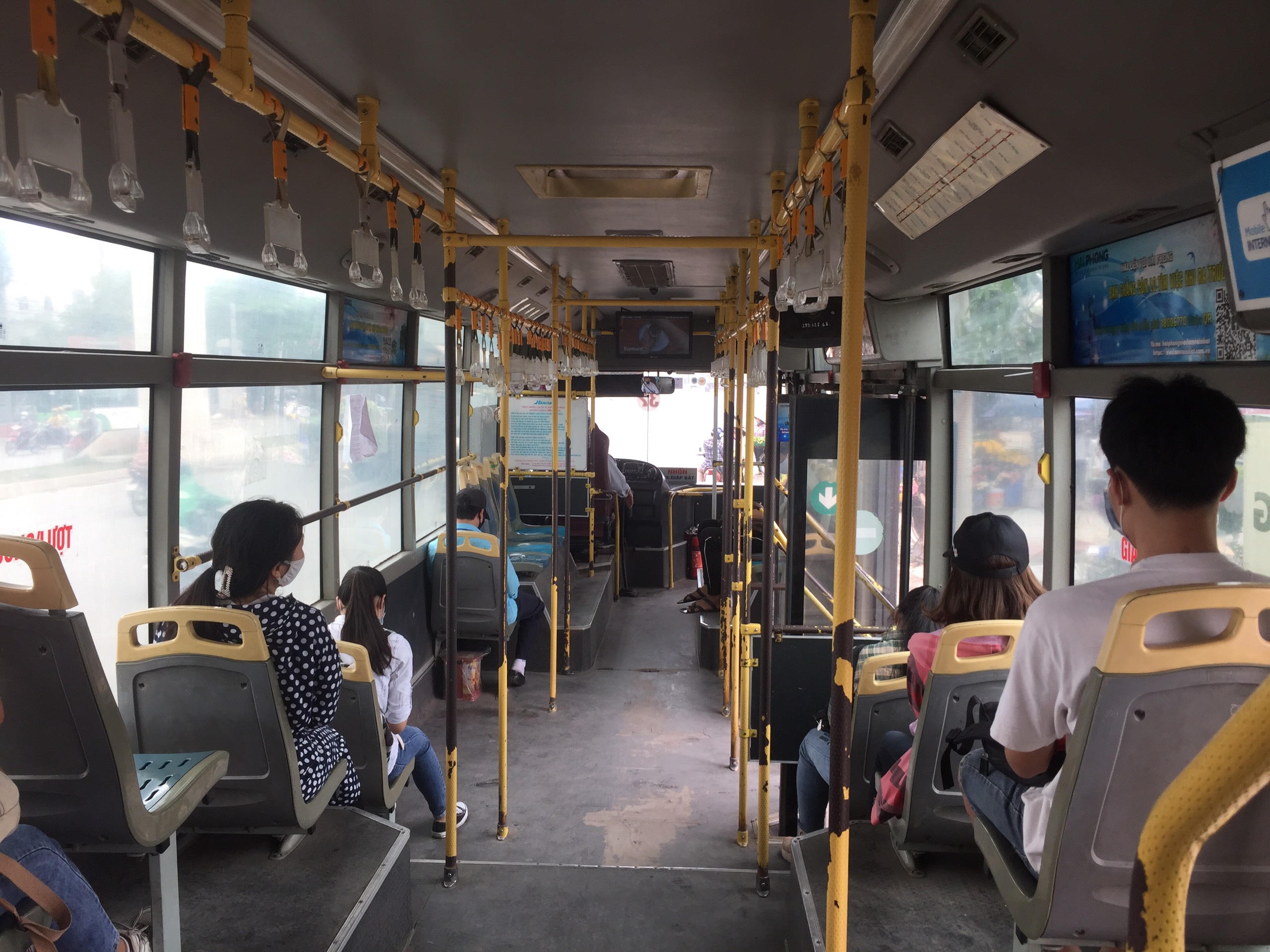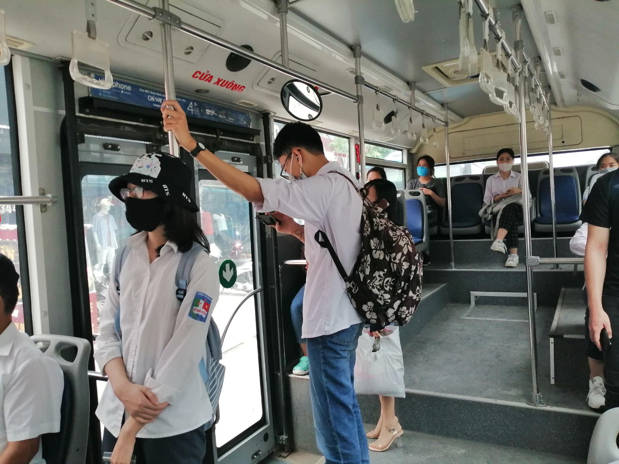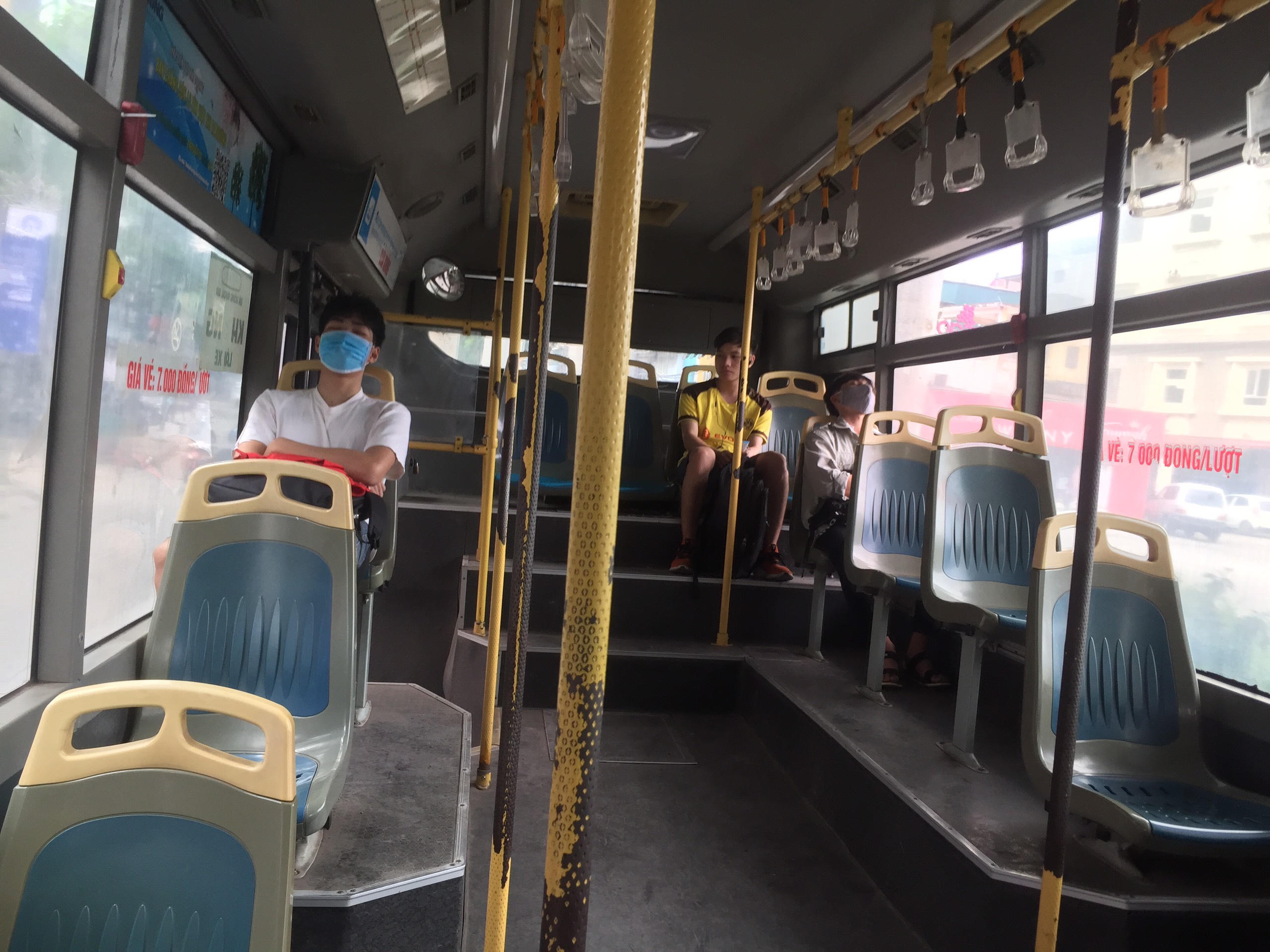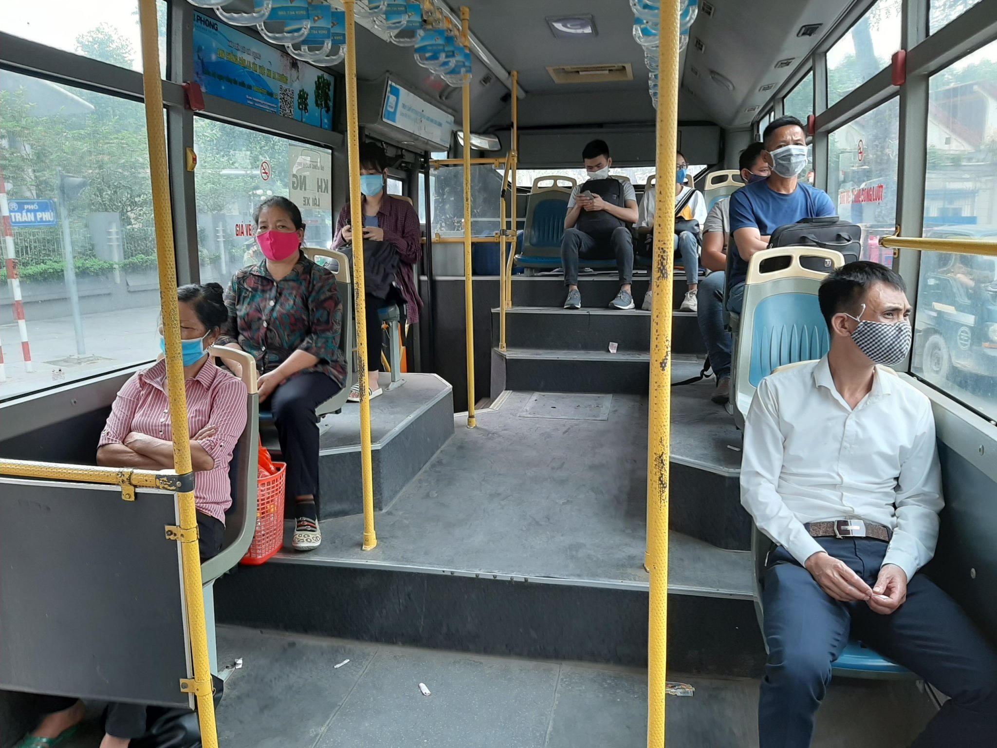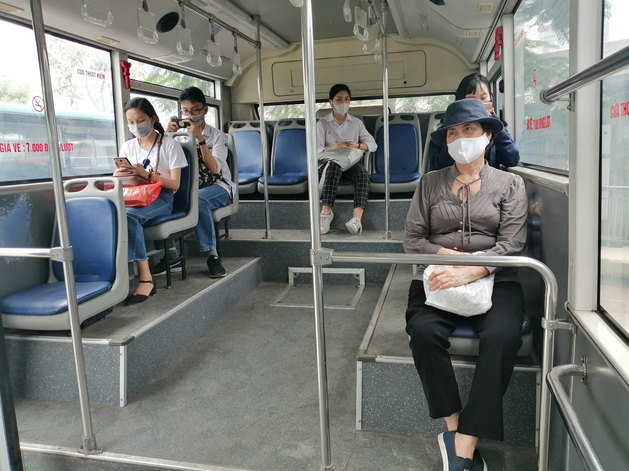 Theo ghi nhận, vào thời điểm tan tầm trưa ngày 7/5, lượng khách trên phương tiện công cộng như xe buýt vẫn ở mức độ thấp hơn so với thời điểm trước dịch. Trung bình số người trên xe giao động từ 10-20 người. Tài xế, phụ xe và các hành khách đều đeo khẩu trang và tuân thủ quy định trên xe.