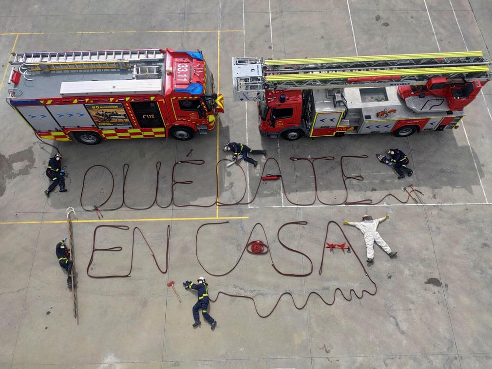 Ban Nha đang trong ngày thứ 6 đóng cửa quốc gia với nỗ lực làm chậm sự lây lan của Covid-19. Lính cứu hỏa sử dụng các vòi nước xếp thành dòng khẩu hiệu ‘Hãy ở nhà'. Tây