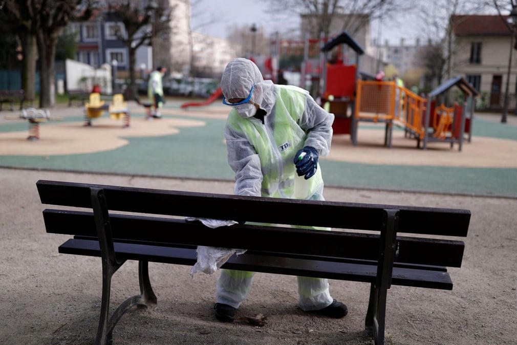Một công nhân làm sạch băng ghế tại sân chơi trẻ em với chất khử trùng