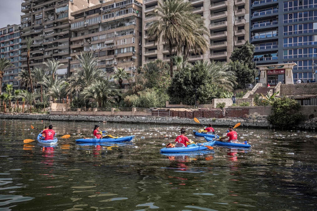 Các tình nguyện viên chèo thuyền kayak tham gia chiến dịch dọn dẹp sông Nile.