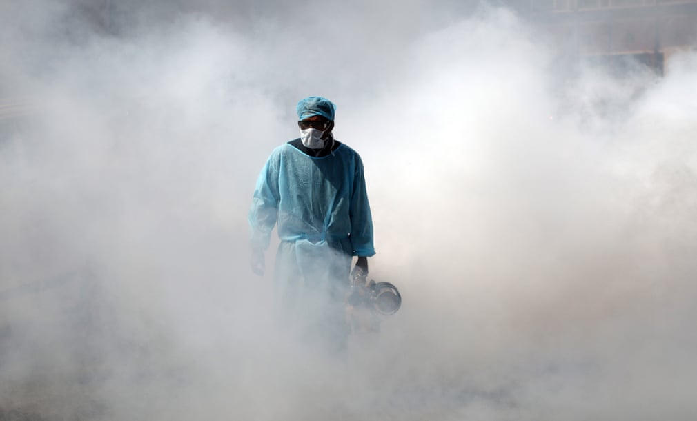 Một nhân viên y tế phun thuốc khử trùng ở khu chợ vắng vẻ sau khi chính quyền ra lệnh đóng cửa tất cả các cửa hàng, trừ hiệu thuốc và cửa hàng tạp hóa, trong nỗ lực ngăn chặn đại dịch virus corona.