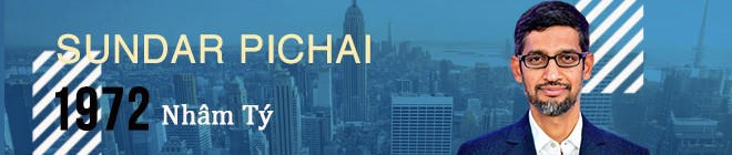 CEO Google Sundar Pichai sinh ngày 10/6/1972, tuổi Nhâm Tý. Năm 2004, anh gia nhập Google, được giao nhiệm vụ dẫn dắt đội kỹ thuật phát triển Chrome OS. Tiếp đó, anh được giao phụ trách thêm Google Toolbar, tìm kiếm trên máy tính cá nhân… Pichai nhanh chóng thuyết phục được nhiều đối tác cài đặt Toolbar lên máy tính, và phổ cập công cụ tìm kiếm Google đến hàng trăm triệu thiết bị trên toàn thế giới.