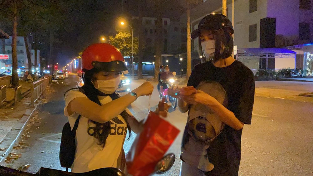 Mặc cho nhiệt độ về đêm xuống thấp, dàn người đẹp không ngại chạy xe máy dọc những con đường ở quận 10, TP HCM để trao quà tận tay những người vô gia cư. Ngoài hiện vật là những phần bánh, Hoa hậu Trần Tiểu Vy còn chuẩn bị thêm 50 bao lì xì, mỗi bao trị giá 500 ngàn đồng.