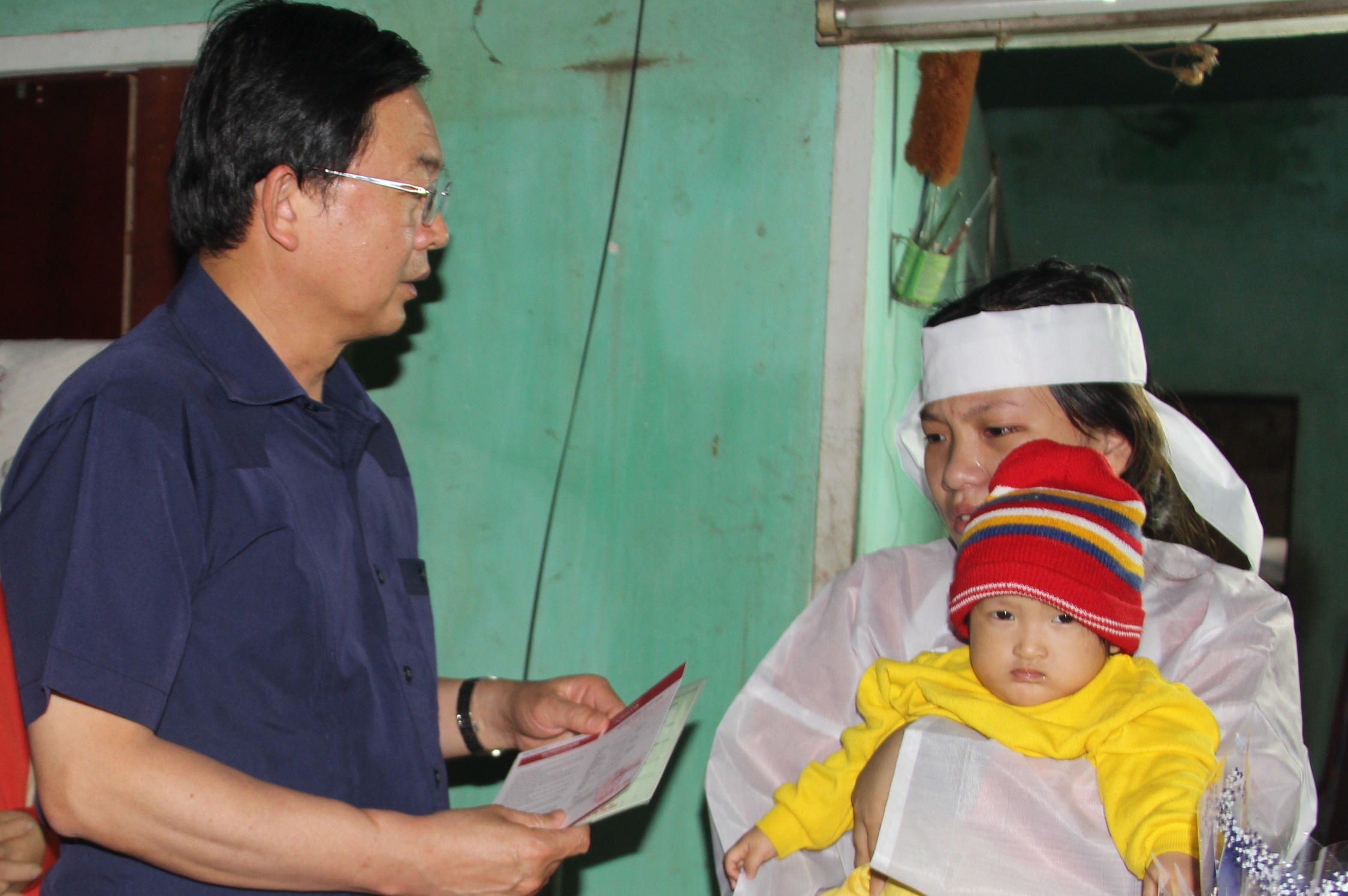 Ngôi nhà cấp 4 của anh Nguyễn Văn Hoài (ngụ phường Tam Quan, thuyền viên tàu cá BĐ 97469-TS) có nhiều người đến thắp hương tại bàn thờ vừa mới lập. “Nó có đứa con gái đầu 2 tuổi bị bệnh tim bẩm sinh, lại sứt môi hở hàm ếch, vợ thì mới sinh con trai được 15 ngày. Cuộc sống gia đình dựa vào nguồn thu nhập chính của nó nhưng nay nó đã lìa xa vợ con, người thân”, bà Ngô Thị Bích Nga (mẹ anh Hoài) nức nở.