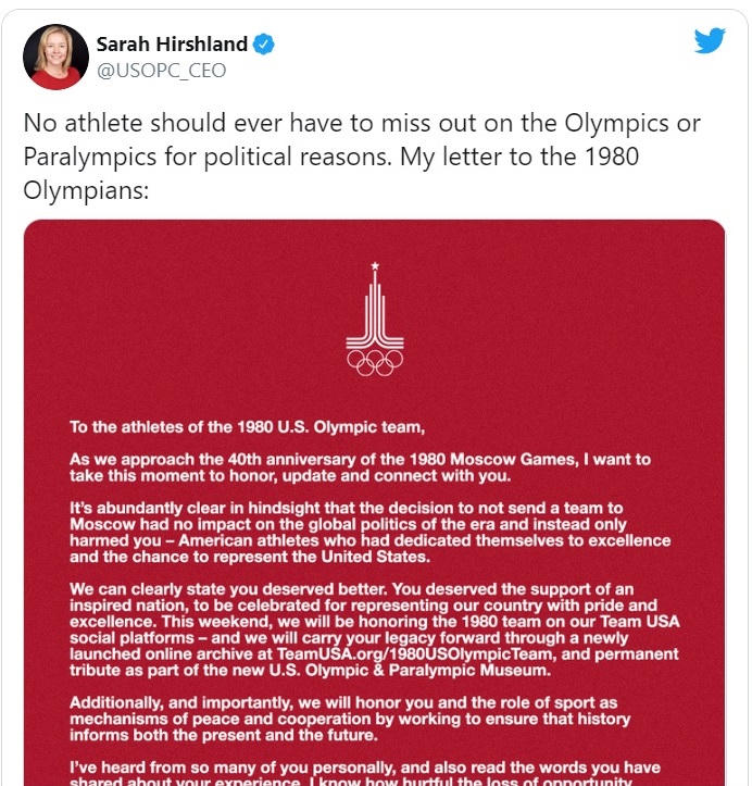 Mới đây, vào ngày 19/7, kỷ niệm 40 năm khai mạc Thế vận hội Moscow 1980, giám đốc điều hành của Ủy ban Olympic và Paralympic Mỹ - bà Sarah Hirshland - đã đăng một bức thư như là một lời xin lỗi. Trong bức thư, gửi đến các vận động viên của đội Olympic Mỹ năm 1980, bà viết: “Rất rõ ràng rằng quyết định không cử đội tới Thế vận hội Moscow chẳng những đã không tác động gì đến chính trị toàn cầu mà chỉ làm hại những vận động viên Mỹ đã nỗ lực cống hiến sức lực cho việc hoàn thiện mình và cơ hội đại diện cho nước Mỹ”.