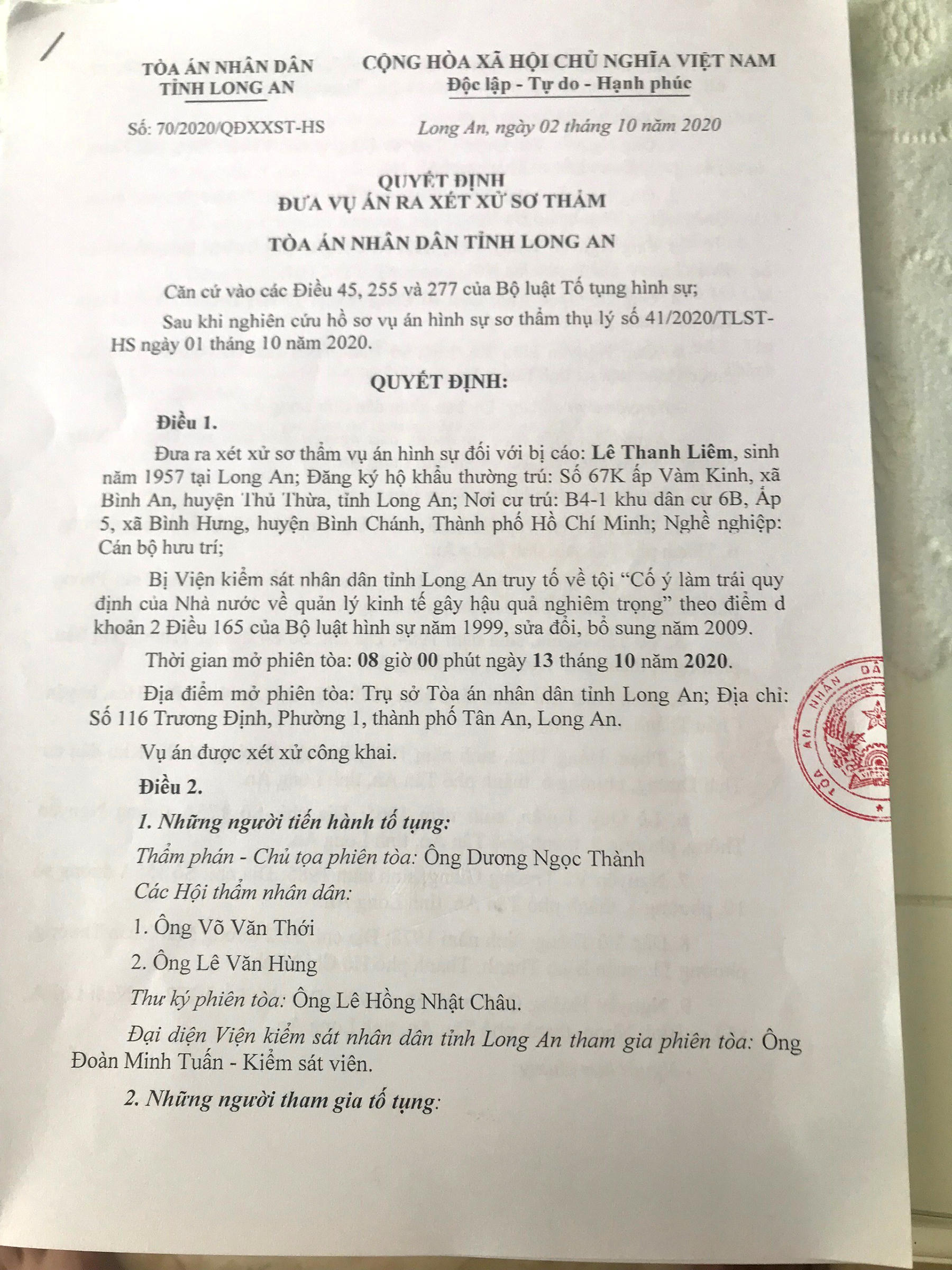 (PLVN) - Hôm qua (2/10), TAND tỉnh Long An ra quyết định đưa vụ án ông Lê Thanh Liêm (nguyên GĐ Sở Y tế) bị truy tố “cố ý làm trái quy định của Nhà nước về quản lý kinh tế gây hậu quả nghiêm trọng” theo khoản 2 Điều 165 BLHS 1999, ra xử sơ thẩm vào ngày 13/10 tới đây.