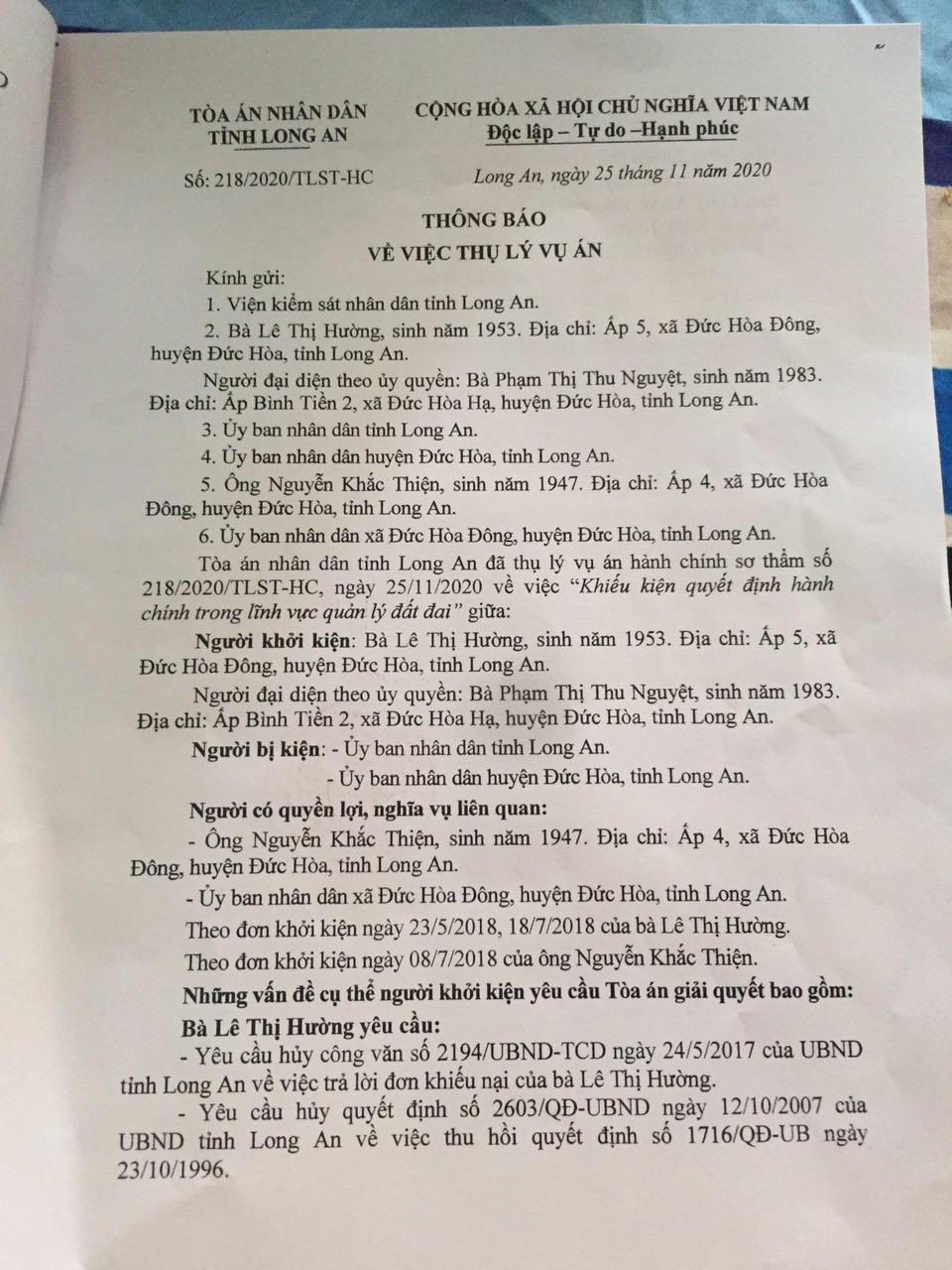 Ngày 26/8/2020, TAND cấp cao tại TP HCM xét xử phúc thẩm vụ án hành chính “Khiếu kiện quyết định trong lĩnh vực quản lý về đất đai”. Theo đó, bà Lê Thị Hường (xã Đức Hòa Đông, huyện Đức Hòa) khởi kiện UBND tỉnh Long An và UBND huyện Đức Hòa về một số quyết định hành chính được cho là trái pháp luật. Trong đó có Quyết định 2603/QĐ-UBND do UBND tỉnh Long An ban hành ngày 12/10/2007 (gọi tắt QĐ 2603).