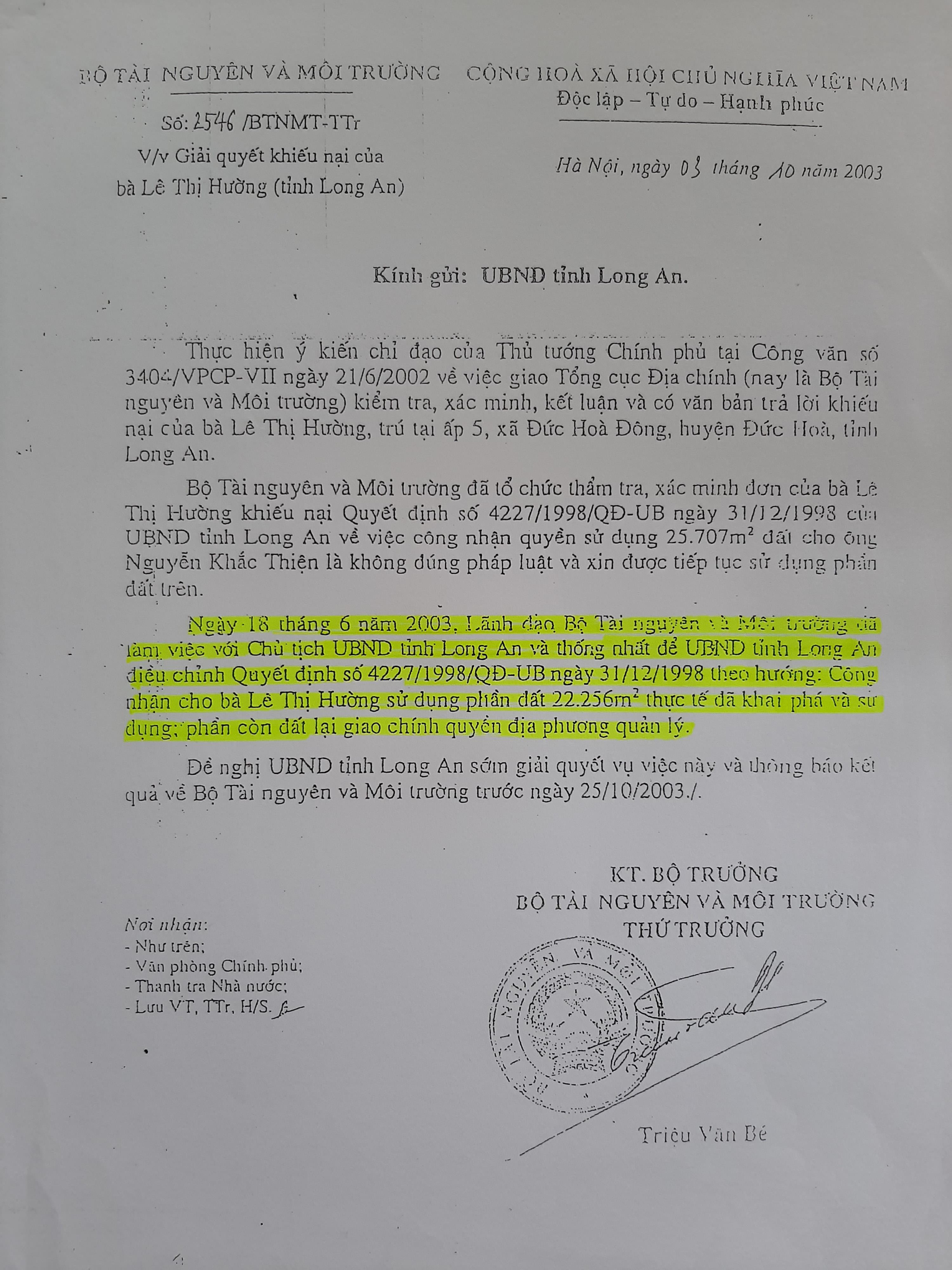 Công văn khẳng định, ngày 18/6/2003, lãnh đạo Bộ TN&MT và UBND tỉnh Long An đã làm việc và thống nhất để tỉnh Long An điều chỉnh Quyết định số 4227/QĐ-UB năm 1998 theo hướng: công nhận cho bà Hường được trực tiếp sử dụng 22.256m2 đất bà đã khai hoang (thửa 741, tờ bản đồ số 5), phần còn lại 3.451m2 giao địa phương quản lý. Cùng ngày, Bộ TN&MT cũng có Công văn 2546/BTNMT-TTr gửi UBND tỉnh Long An, đề nghị sớm giải quyết vụ việc như đã thống nhất và báo cáo Thủ tướng.