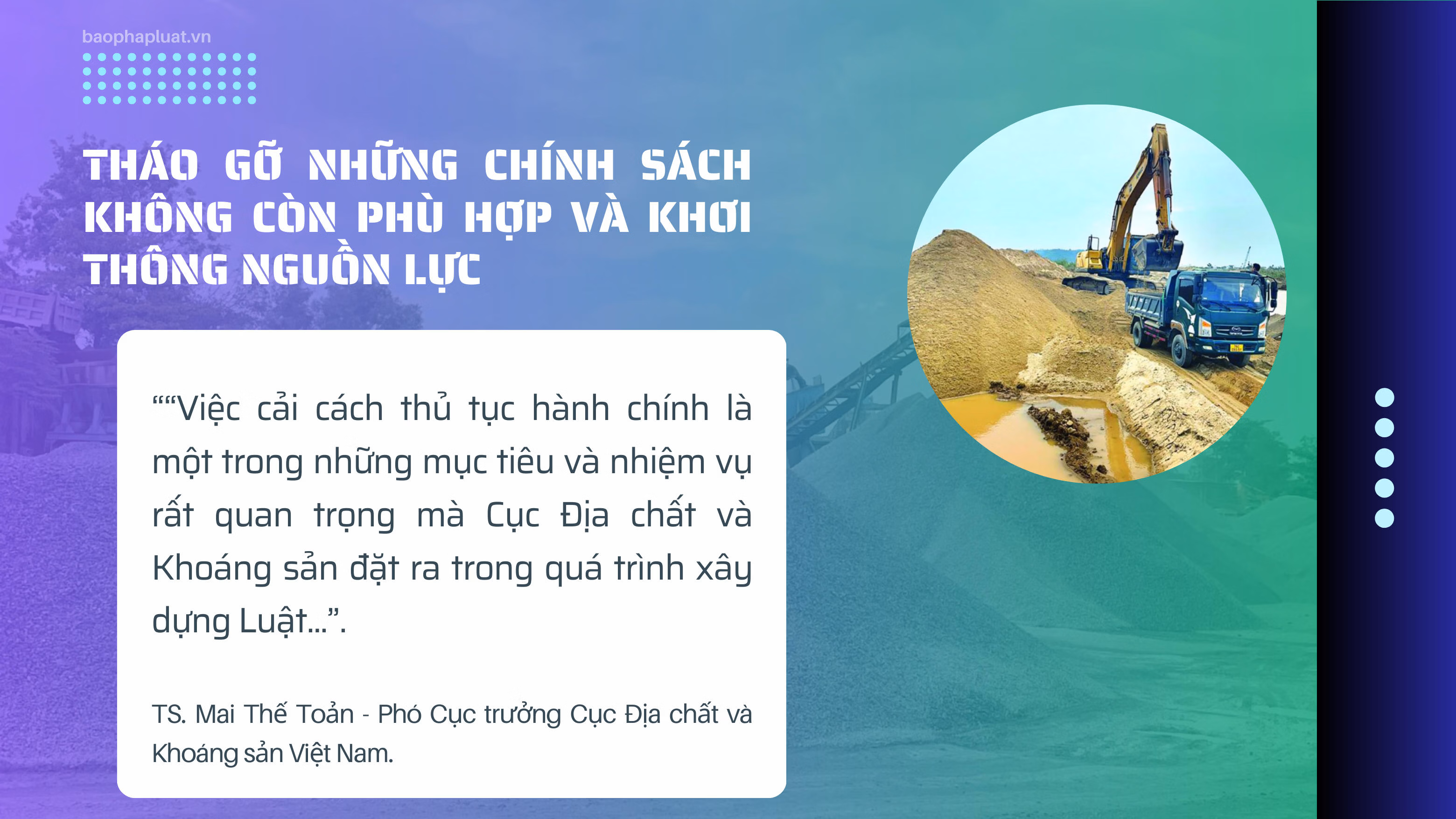 Theo TS. Mai Thế Toản - Phó Cục trưởng Cục Địa chất và Khoáng sản: “Việc cải cách thủ tục hành chính là một trong những mục tiêu và nhiệm vụ rất quan trọng mà Cục Địa chất và Khoáng sản đặt ra trong quá trình xây dựng Luật theo đúng tinh thần Nghị quyết 10 của Bộ Chính trị và trong làn sóng chung của Việt Nam là tăng cường cải cách