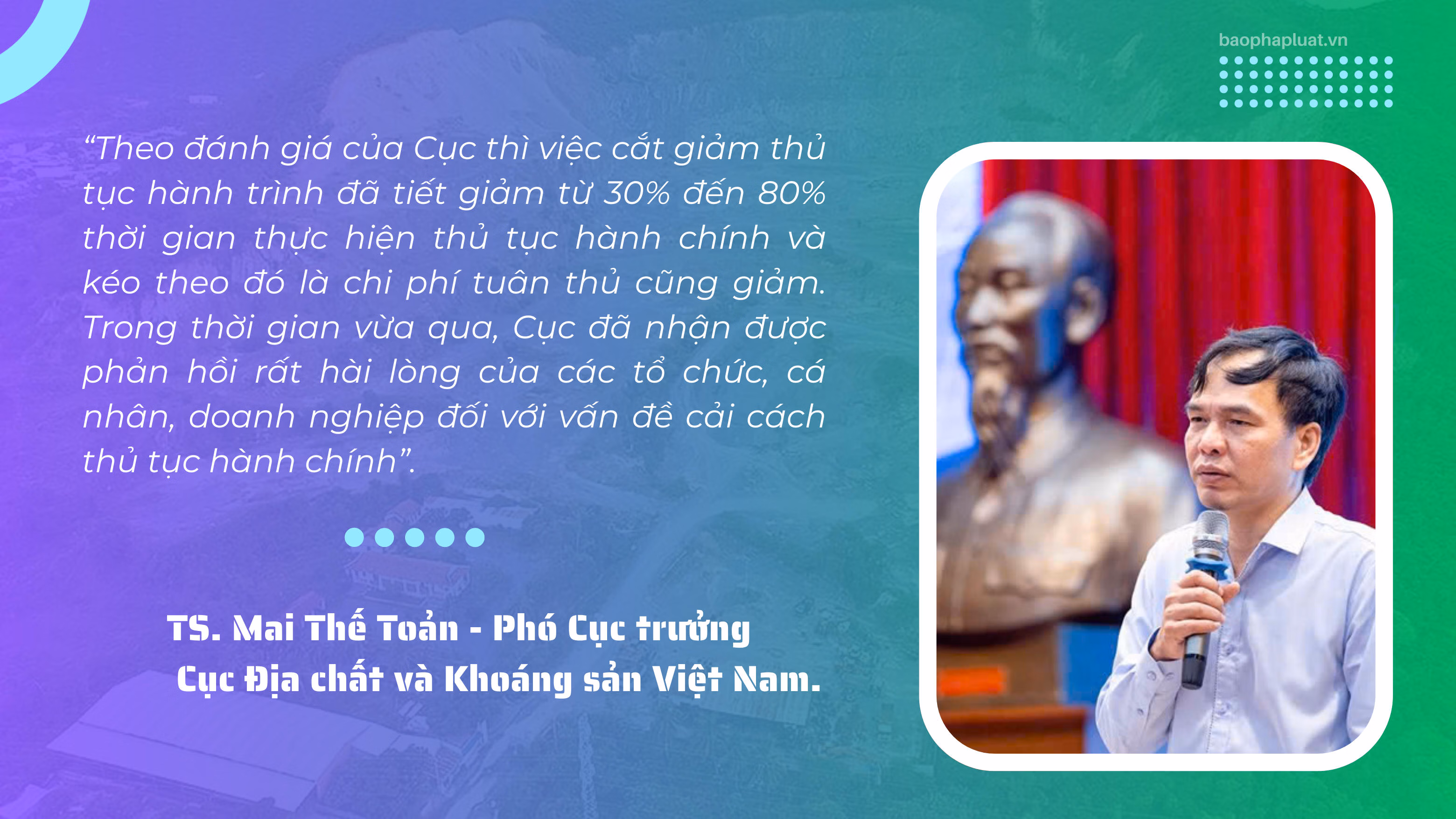 “Theo đánh giá của Cục thì việc cắt giảm này đã tiết giảm từ 30% đến 80% thời gian thực hiện thủ tục hành chính và kéo theo đó là chi phí tuân thủ cũng giảm. Trong thời gian vừa qua, Cục đã nhận được nhiều phản hồi hài lòng của các tổ chức, cá nhân, doanh nghiệp đối với vấn đề cải cách thủ tục hành chính”, - TS. Mai Thế Toản - Phó Cục trưởng Cục Địa chất và Khoáng sản Việt Nam cho biết thêm.