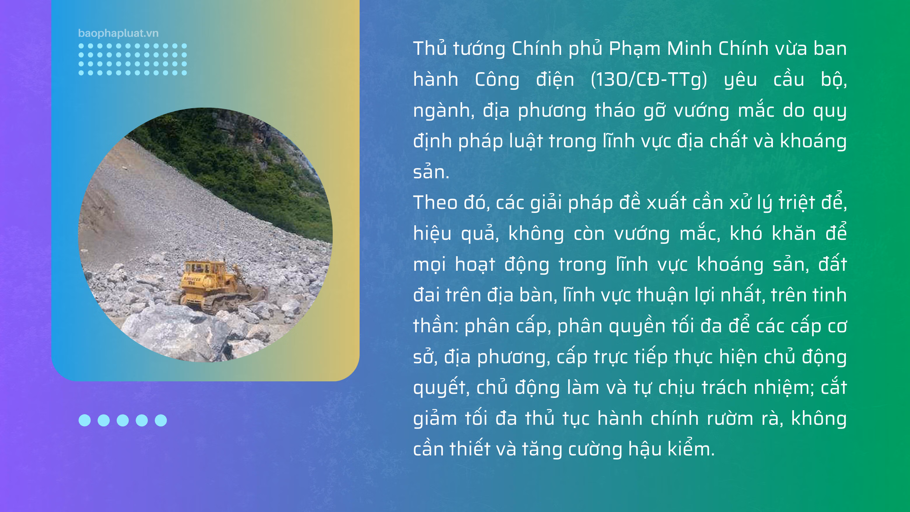 Cũng nhằm tháo gỡ rào cản pháp lý về khoáng sản, đất đai, Thủ tướng Chính phủ Phạm Minh Chính vừa có Công điện (130/CĐ-TTg) yêu cầu bộ, ngành, địa phương tháo gỡ vướng mắc do quy định pháp luật trong lĩnh vực này. Công điện gửi bộ trưởng các bộ: Nông nghiệp và Môi trường, Xây dựng, Công Thương, Tài chính, Tư pháp; Chủ tịch Ủy ban nhân dân các tỉnh, thành phố trực thuộc Trung ương.