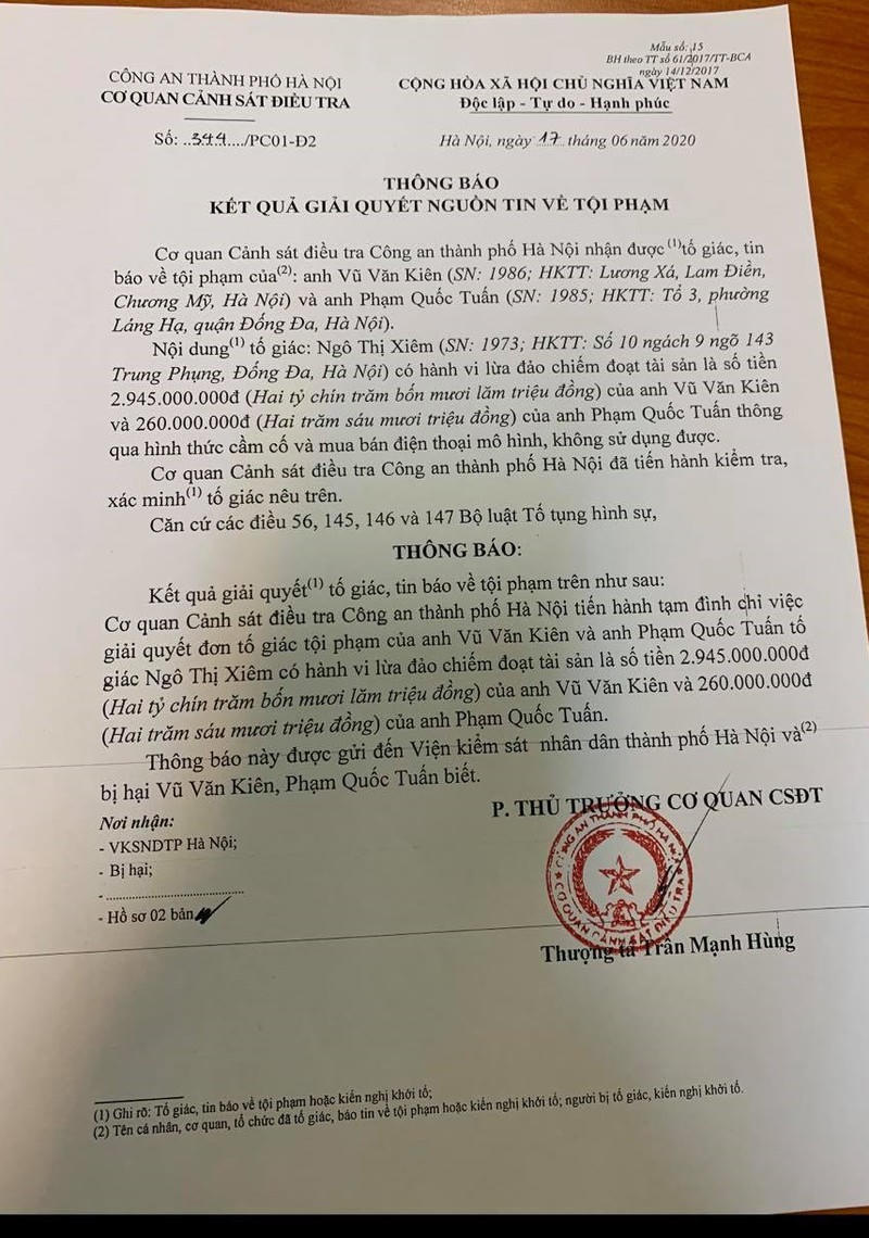 Trong đơn kêu cứu, anh Tuấn trình bày, khoảng tháng 12/2019, anh đã làm đơn tố cáo bà Xiêm tới cơ quan điều tra. Trước đó, vào tháng 10/9/2019, anh Kiên cũng đã làm đơn gửi đến Cơ quan Cảnh sát điều tra Công an TP Hà Nội tố cáo bà Ngô Thị Xiêm, có hành vi lừa đảo, chiếm đoạt tài sản. Đến ngày 17/6/2020, Cơ quan Cảnh sát điều tra Công an TP Hà Nội mới ra Thông báo kết quả giải quyết nguồn tin về tội phạm số 344/PC01 – Đ2.