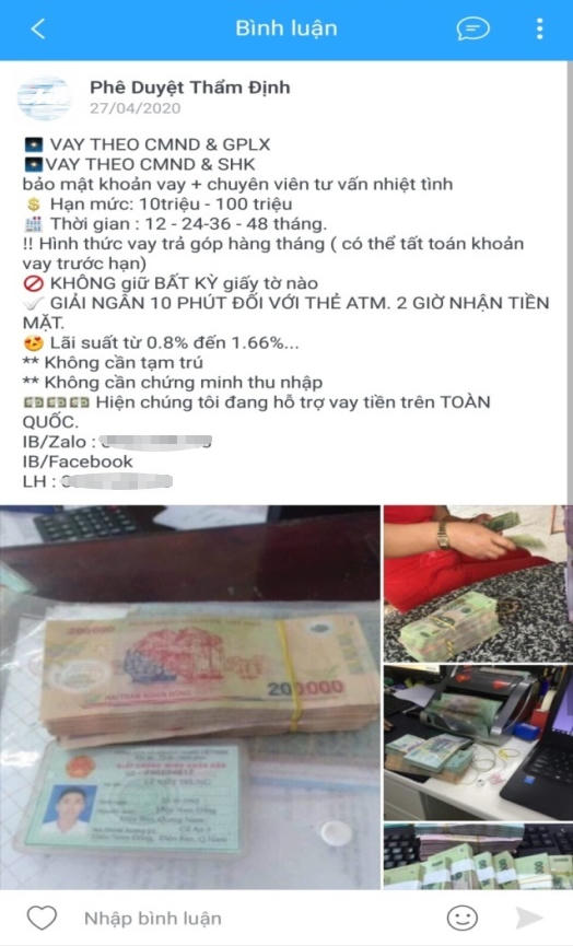 Sử dụng hình ảnh giả mạo gửi cho khách hàng để chứng minh khách hàng đã được giải ngân khoản vay vào tài khoản vừa mở tại ngân hàng;