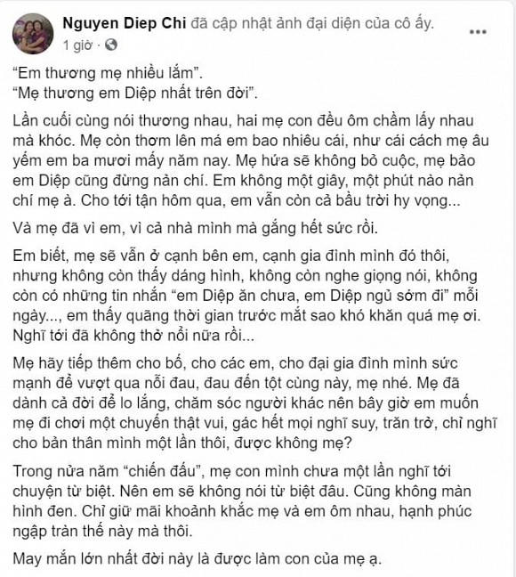 Và mẹ đã vì em, vì cả nhà mình mà gắng hết sức rồi. Em biết, mẹ sẽ vẫn ở cạnh bên em, cạnh gia đình mình đó thôi, nhưng không còn thấy dáng hình, không còn nghe giọng nói, không còn có những tin nhắn “em Diệp ăn chưa, em Diệp ngủ sớm đi” mỗi ngày..., em thấy quãng thời gian trước mắt sao khó khăn quá mẹ ơi. Nghĩ tới đã không thở nổi nữa rồi...