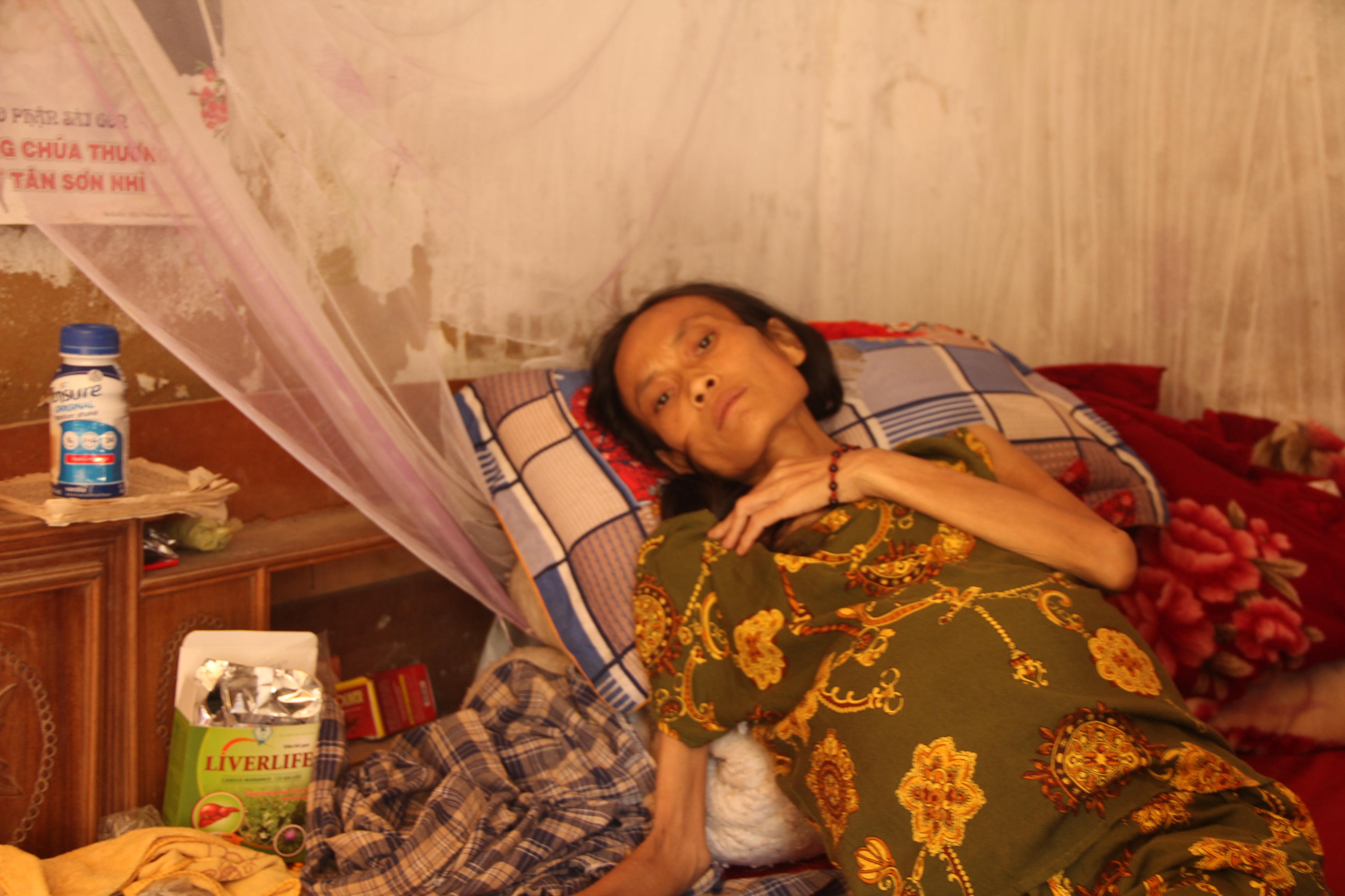 Căn nhà nhỏ vỏn vẹn 28 m2 là nơi tá túc của 6 thành viên trong gia đình chị Hoàng Thị Chuyên (39 tuổi, ngj xóm Mai Giang 1, xã Quỳnh Bảng, huyện Quỳnh Lưu, tỉnh Nghệ An) nhiều năm nay. Trong căn nhà cũ ấy, chị Chuyên nằm bất lực trên giường với thân hình gầy gò, tiều tụy vì ung thư tụy giai đoạn cuối. Người thân cho hay, đã nhiều ngày nay, chị hầu như không ăn uống được gì ngoài nuốt đôi ngụm sữa.