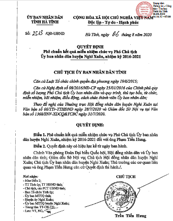 Ngày 6/8/2020, Chủ tịch UBND tỉnh Hà Tĩnh Trần Tiến Hưng ký Quyết định số 2513/QĐ-UBND về việc phê chuẩn kết quả miễn nhiệm chức vụ Phó Chủ tịch UBND huyện Nghi Xuân, nhiệm kỳ 2016-2021 đối với ông Phạm Tiến Hưng.