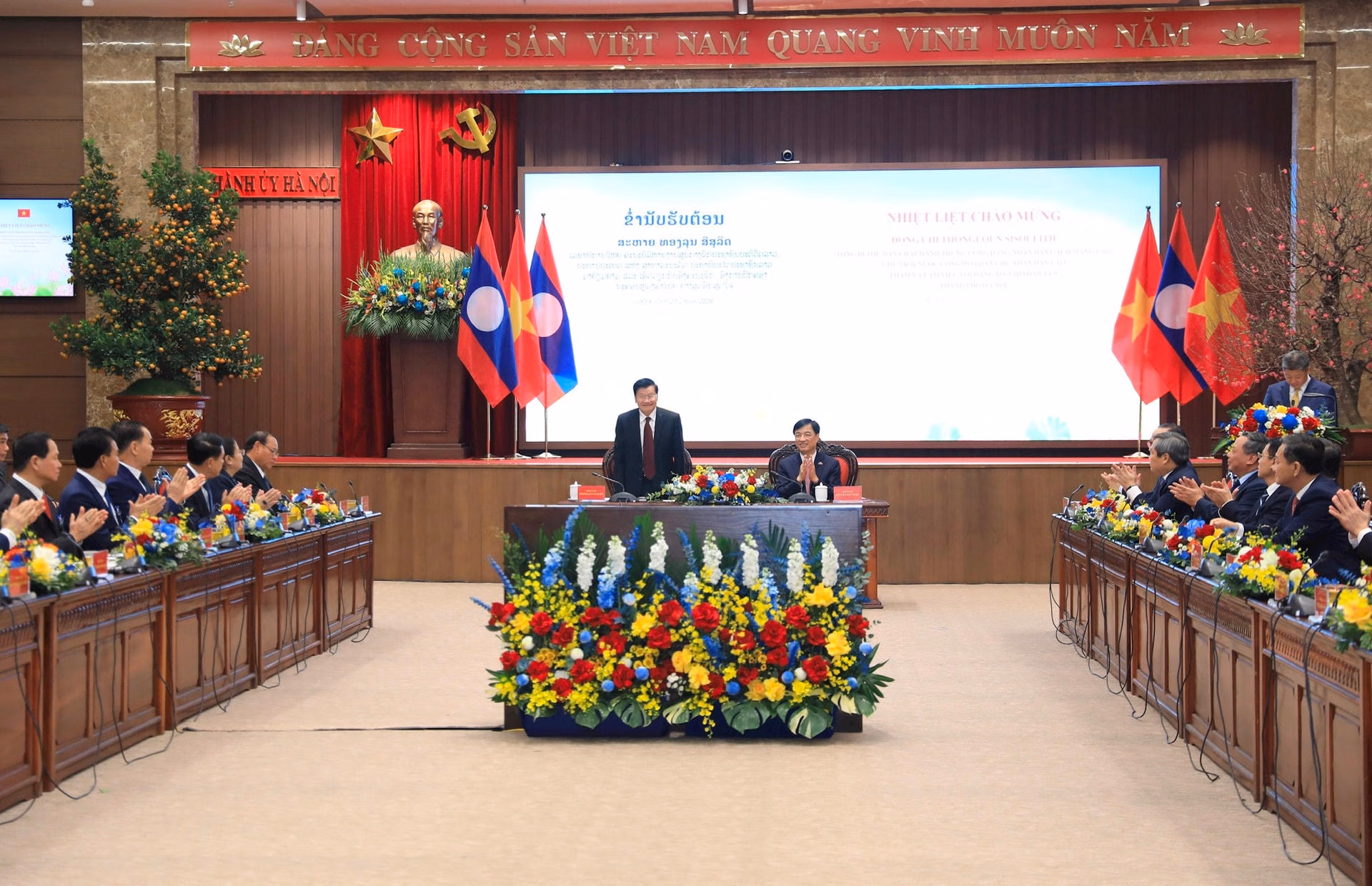 Ngày 27/1, Ban Thường vụ Thành ủy Hà Nội tổ chức hội nghị đón tiếp đồng chí Thongloun Sisoulith - Tổng Bí thư Đảng Nhân dân Cách mạng Lào, Chủ tịch nước Cộng hòa Dân chủ Nhân dân (CHDCND) Lào và Đoàn Đại biểu nước CHDCND Lào thăm, làm việc với Đảng bộ, chính quyền thành phố.