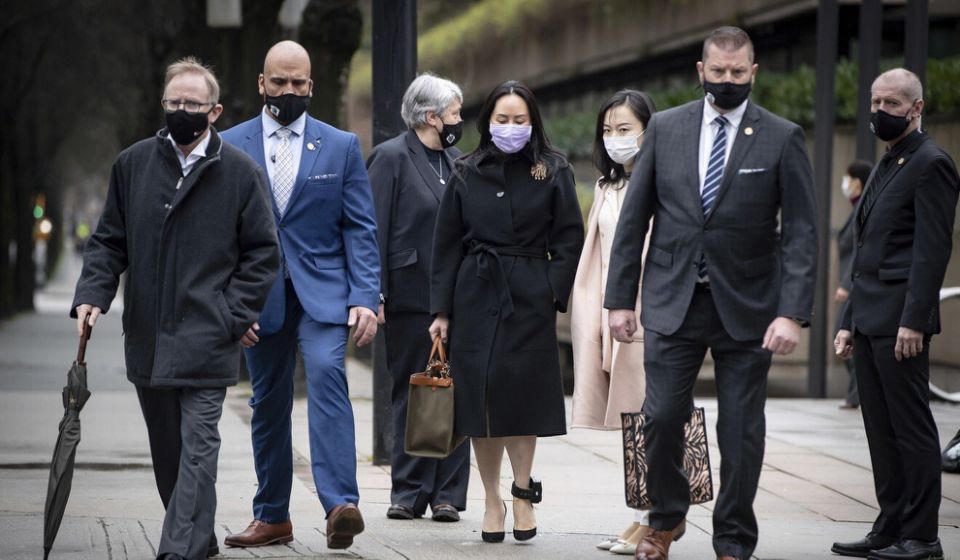 CFO của Huawei cũng từng chụp ảnh chung với một nhóm người không đeo khẩu trang trước tòa án Vancouver hồi tháng 5/2020.