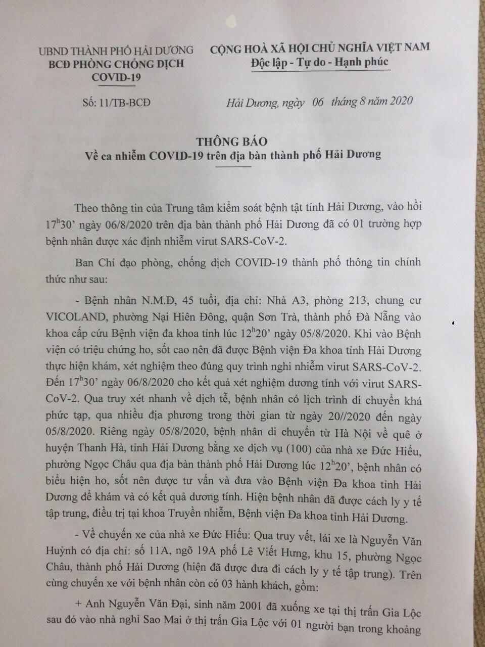 Đến ngày 5/8, ông Nguyễn M.Đ đi xe chở khách của nhà xe Đức Hiếu (có địa chỉ ở phố Lê Viết Hưng, TP Hải Dương) từ Hà Nội về Hải Dương. Trên xe có thêm 3 người khách và 1 lái xe. Đến 12h20 ngày 5/8 ông Nguyễn M.Đ thấy khó chịu thì nhập Bệnh viện Đa khoa tỉnh Hải Dương điều trị. Trung tâm kiểm soát bệnh tật tỉnh Hải Dương đã lấy mẫu xét nghiệm và tối 6/8 cho kết quả dương tính với SARS-CoV-2.