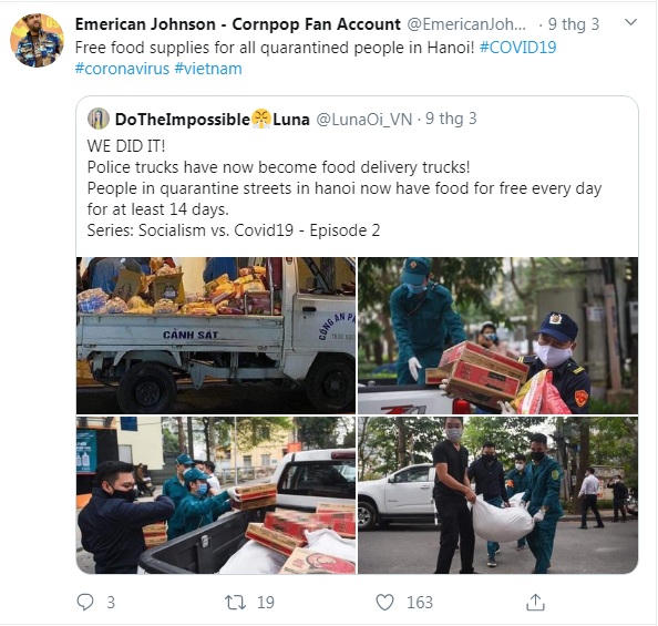 Việt Nam là quốc gia đầu tiên kiểm soát SARS và COVID-19 (không có trường hợp tử vong), cũng như đã phát triển một bộ xét nghiệm nhanh trong một tháng mà WHO cho rằng phải mất bốn năm. WHO hiện đang làm việc cùng Việt Nam để nhận trợ giúp cho cuộc khủng hoảng toàn cầu. Tất nhiên điều này không có trên các kênh tin tức của chúng tôi.
