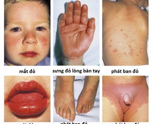 Triệu chứng của bệnh này bao gồm: sốt cao liên tục trong 5 ngày, phát ban, hạch sưng ở cổ, môi khô nứt nẻ, ngón tay, ngón chân và mắt có màu đỏ. Đây không phải là bệnh truyền nhiễm và nếu được điều trị kịp thời, bệnh sẽ không diễn biến nghiêm trọng và có thể chữa khỏi hoàn toàn.