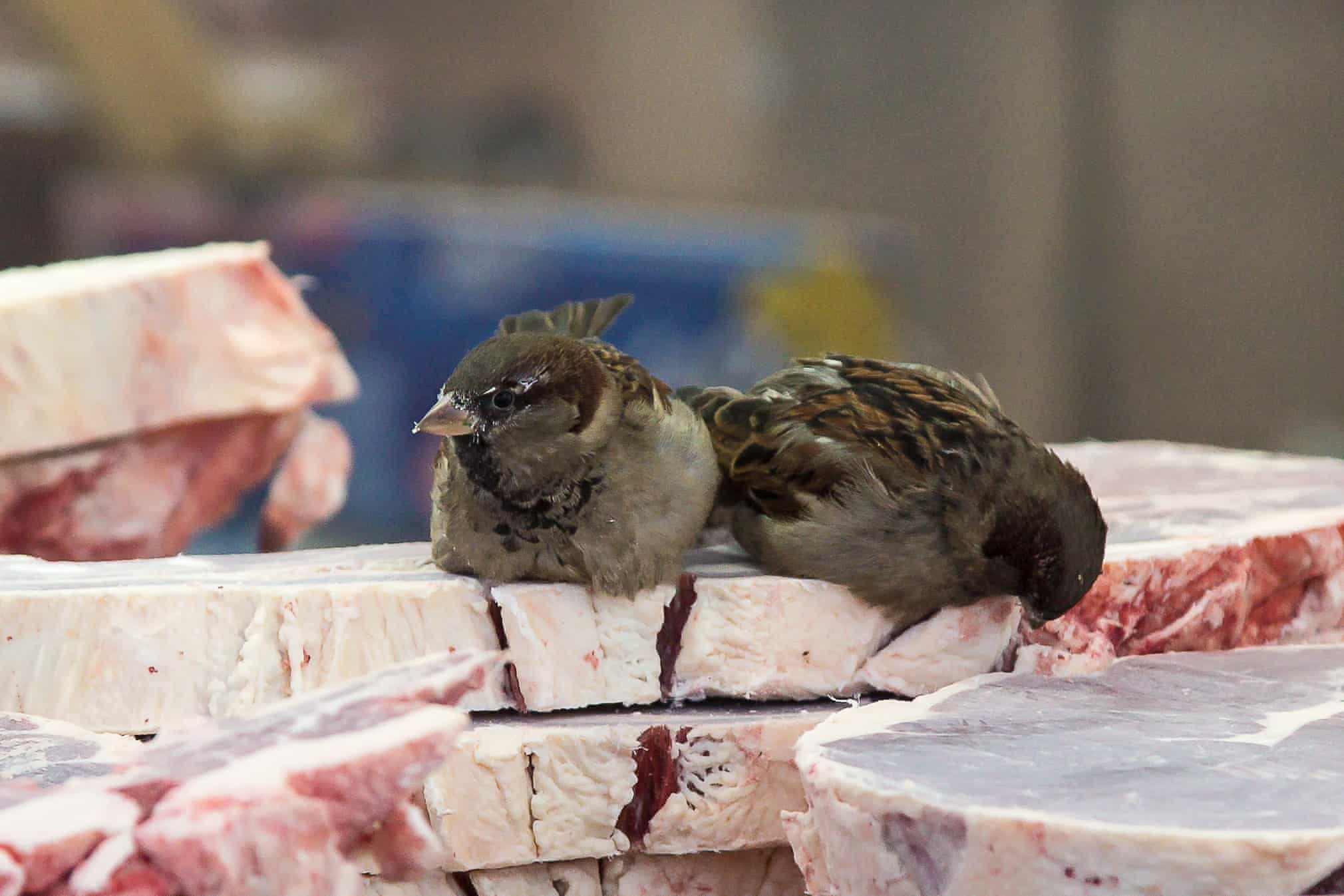 Chim sẻ đậu trên thịt đông lạnh bán ở chợ.