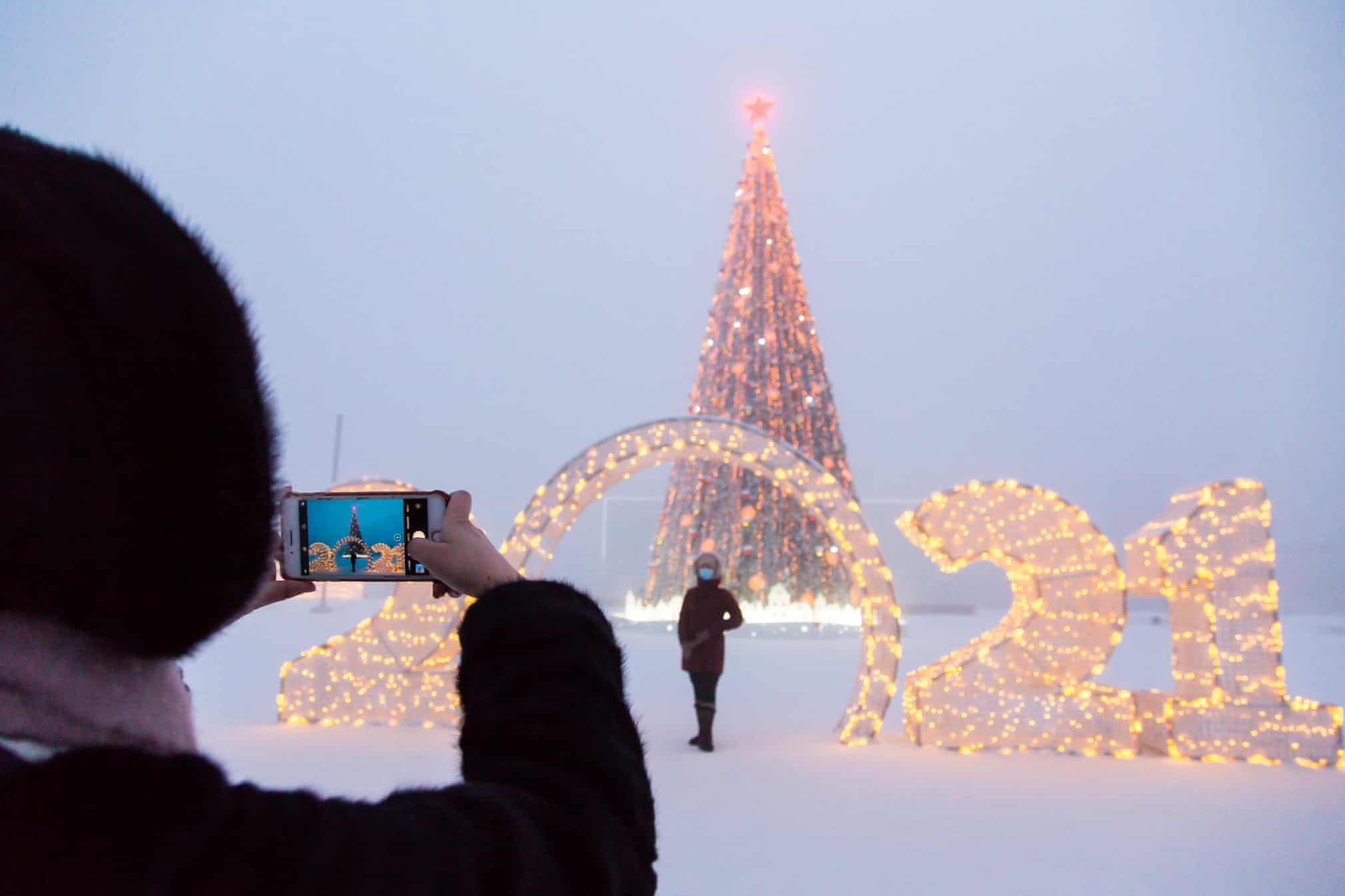 Một người tạo dáng chụp ảnh trước cây thông Noel được chiếu sáng và biển báo năm 2021.
