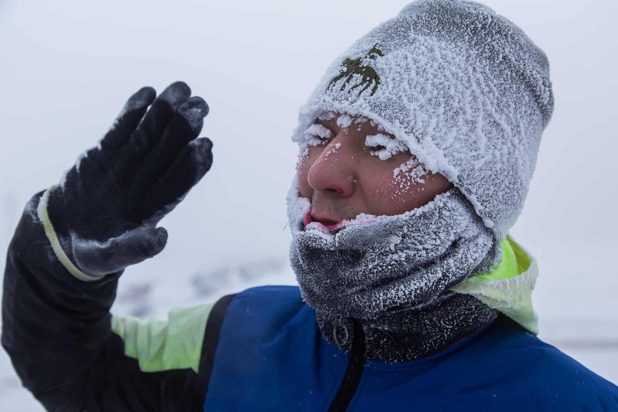 Lông mi của một người đàn ông đóng băng sau khi chạy bộ ở Quảng trường Chiến thắng.