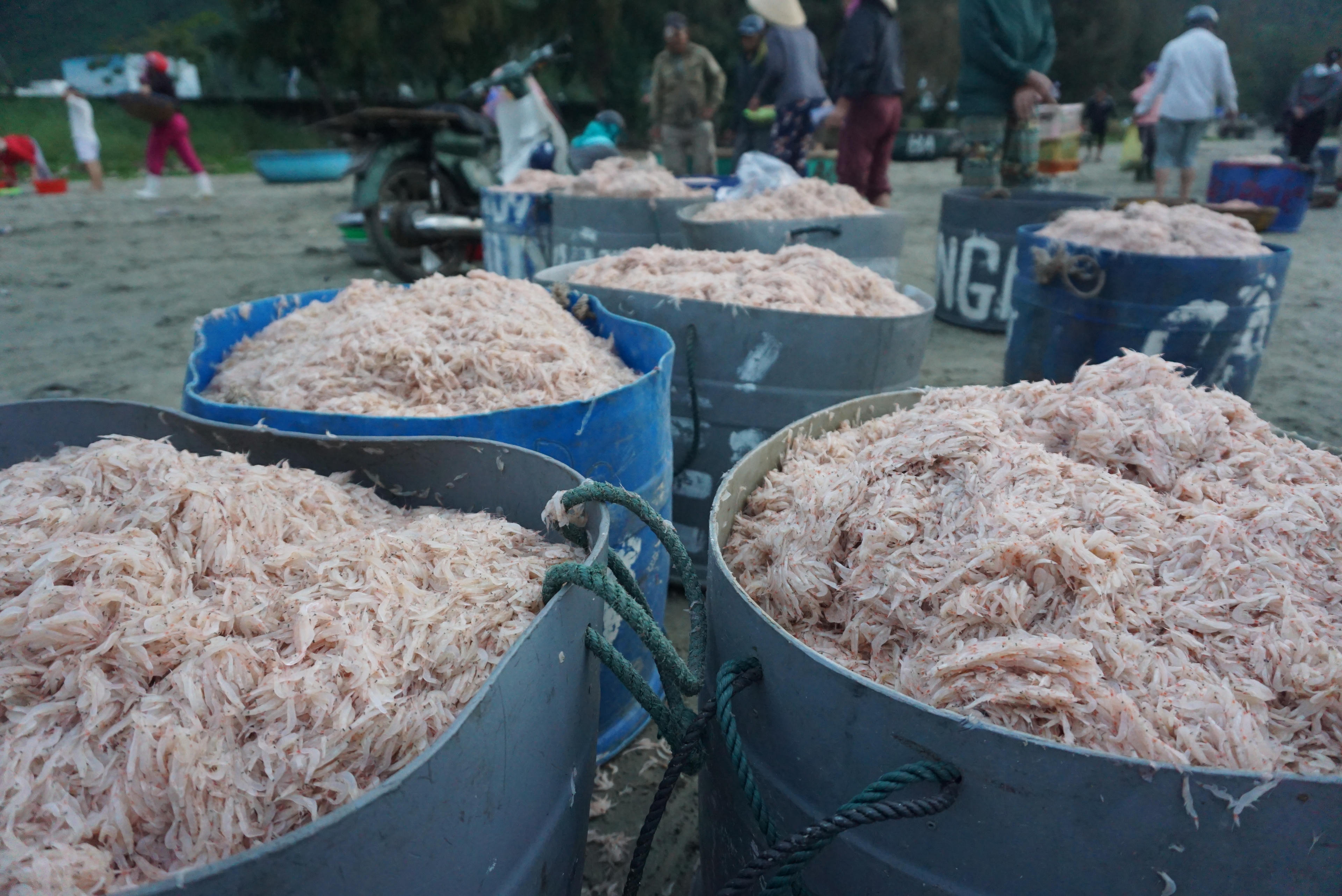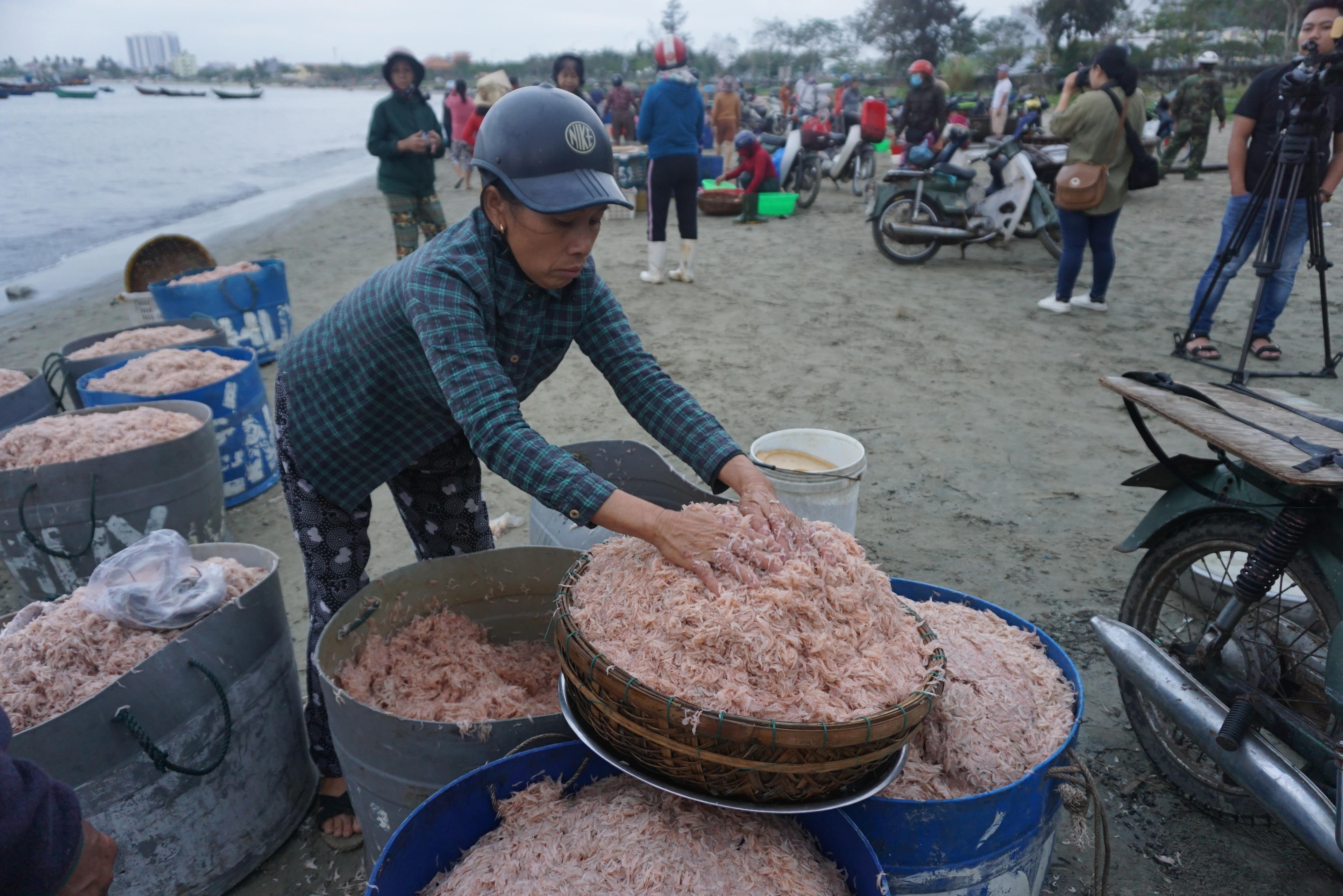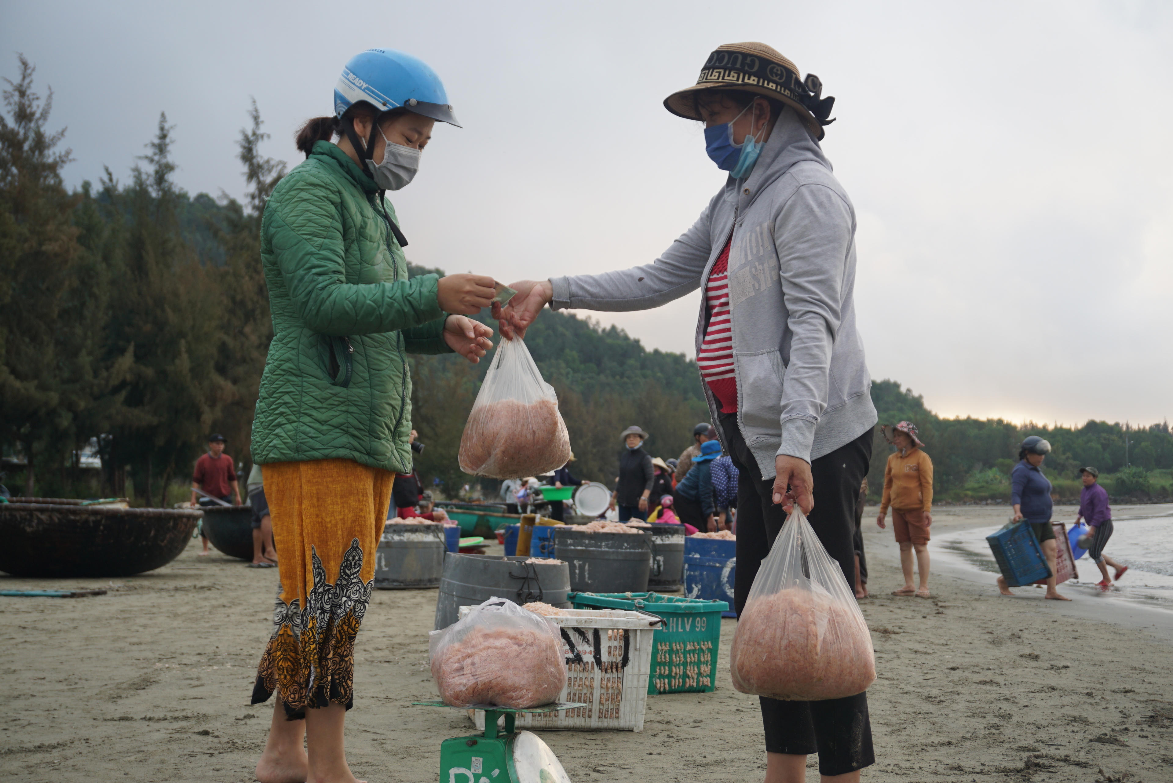 Cảnh mua bán ruốc nhộn nhịp cả bãi biển buổi sớm mai.