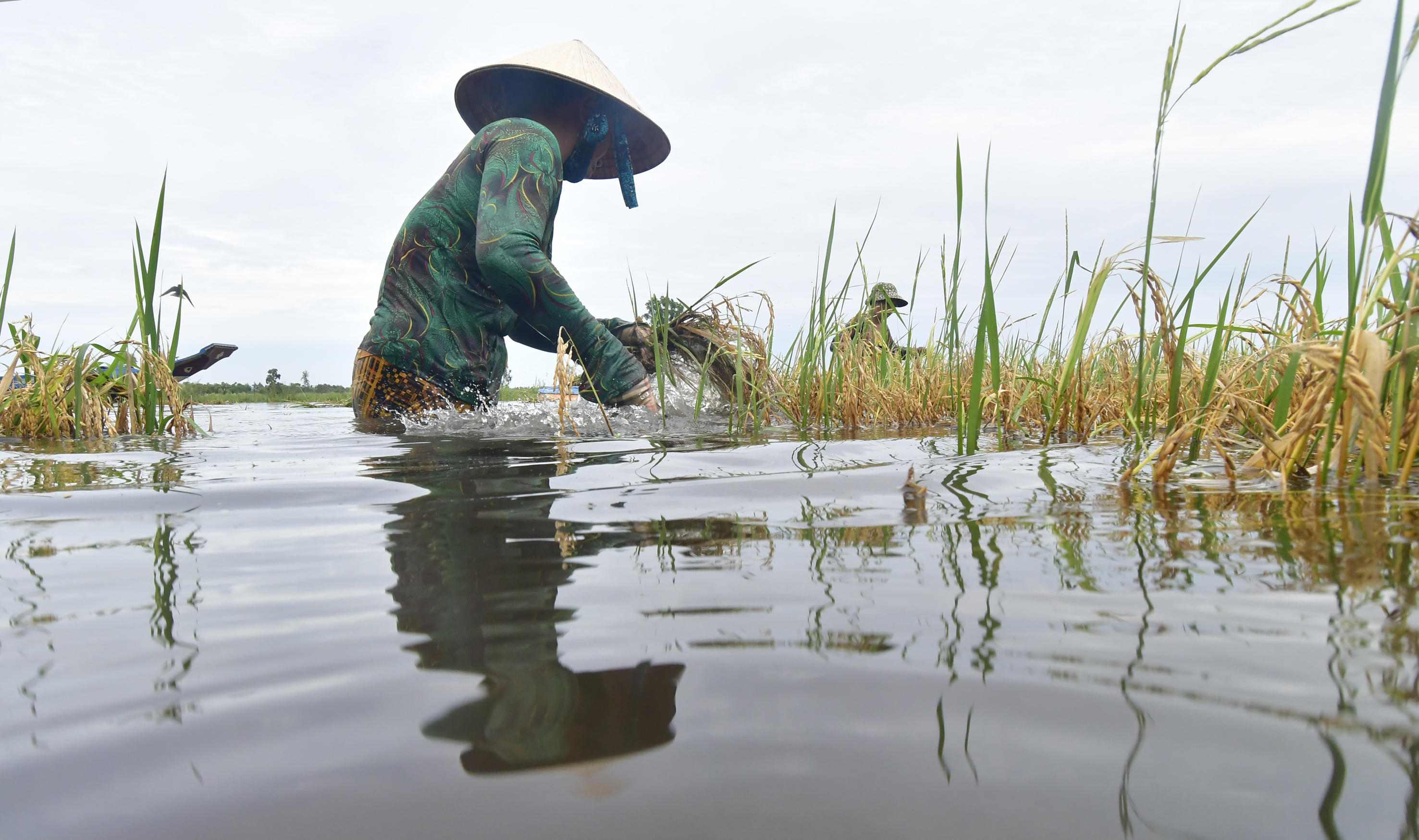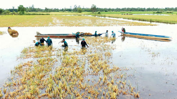 Người dân ở ấp Thâm Trơi B, xã Khánh Bình Đông (Trần Văn Thời, Cà Mau) tranh thủ ra đồng thu hoạch lúa đang ngập chìm trong nhiều ngày qua được chút nào hay chút đó. Cùng với đó, trên cánh đồng vàng ngập đã xuất hiện màu áo xanh của lực lượng dân quân tự vệ giúp dân thu hoạch. Do diện tích bị ngập còn khá nhiều, lên đến hàng nghìn ha, nên lực lượng dân quân tự vệ cũng chỉ thu hoạch giúp dân một phần nhằm có lúa để ăn, phần còn lại người dân tự thu hoạch.
